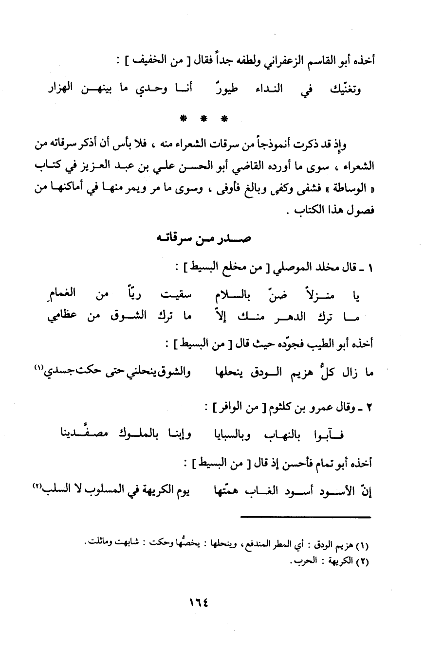 وَإِذ قد ذكرت أنموذجا من سرقات الشُّعَرَاء مِنْهُ فَلَا بَأْس أَن أذكر سرقاته من الشُّعَرَاء سوى مَا أوردهُ القَاضِي أَبُو الْحسن عَليّ بن عبد الْعَزِيز فِي كتاب الوساطة فشفى وَكفى وَبَالغ فأوفى وَسوى مَا مر ويمر مِنْهَا فِي أماكنها من فُصُول هَذَا الْكتاب