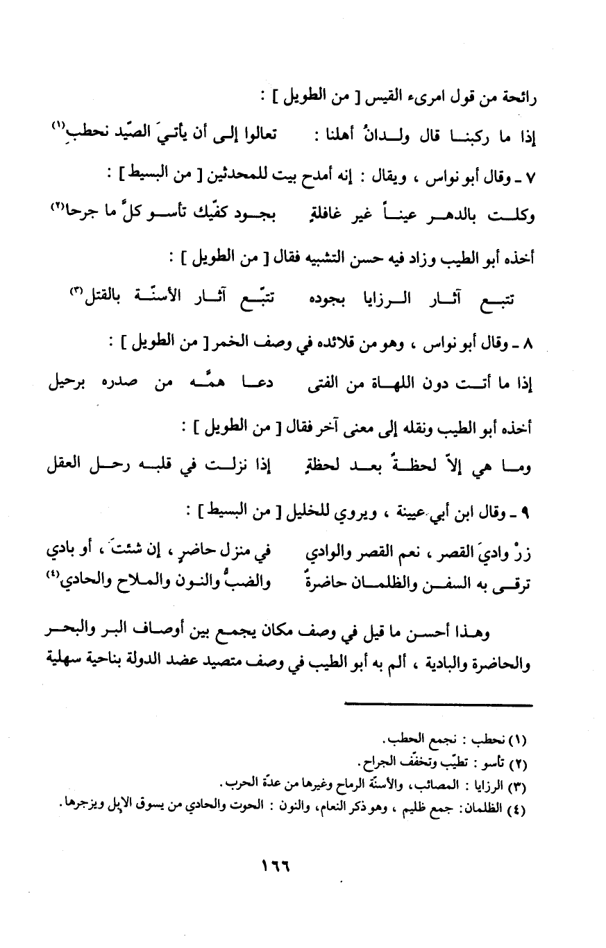 وَهَذَا أحسن مَا قيل فِي وصف مَكَان يجمع بَين أَوْصَاف الْبر وَالْبَحْر والحاضرة والبادية ألم بِهِ أَبُو الطّيب فِي وصف متصيد عضد الدولة بِنَاحِيَة سهلية