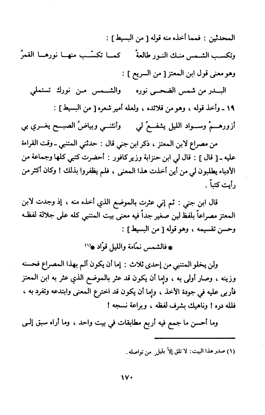 من مصراع لِابْنِ المعتز ذكر ابْن جني قَالَ حَدثنِي المتنبي وَقت الْقِرَاءَة عَلَيْهِ قَالَ قَالَ لي حنزابة وَزِير كافور أحضرت كتبي كلهَا وَجَمَاعَة من الأدباء يطْلبُونَ لي من أَيْن أخذت هَذَا الْمَعْنى فَلم يظفروا بذلك وَكَانَ أَكثر من رَأَيْت كتبا