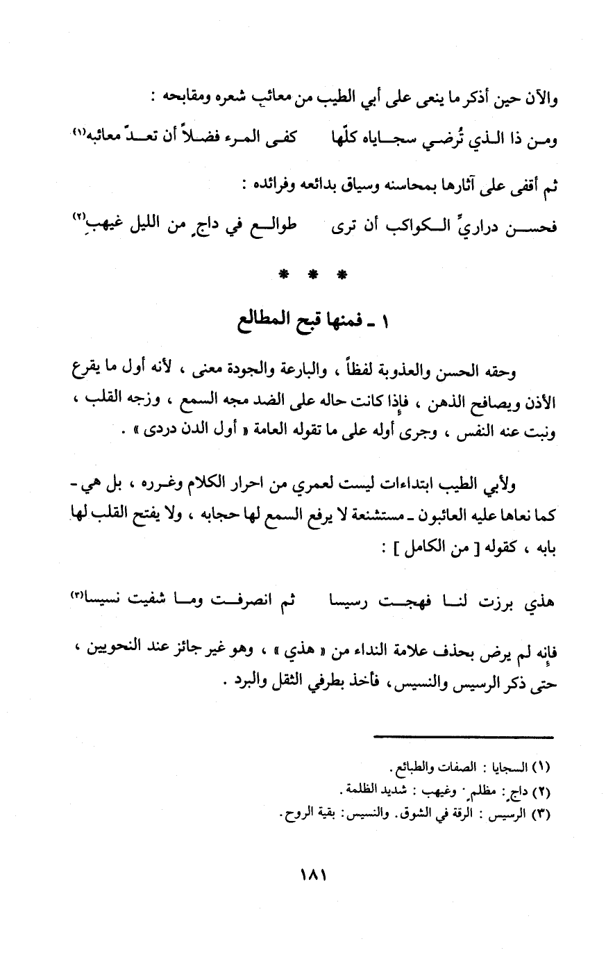 وَلأبي الطّيب ابتداءات لَيست لعمري من أَحْرَار الْكَلَام وغرره بل هِيَ كَمَا نعاها عَلَيْهِ العائبون مستشنعة لَا يرفع السّمع لَهَا حجابه وَلَا يفتح الْقلب لَهَا بَابه كَقَوْلِه