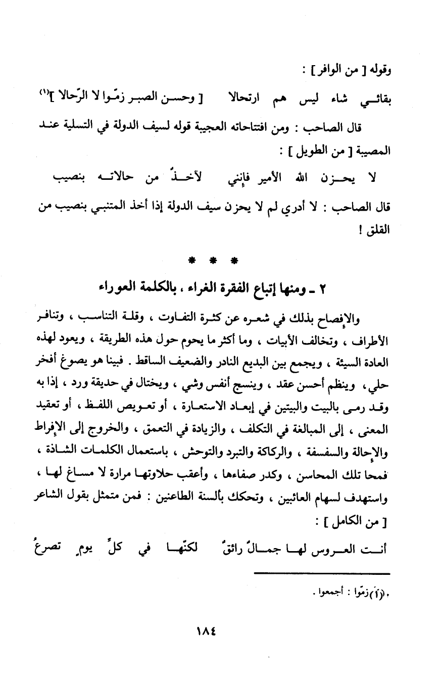 والإفصاح بذلك فِي شعره عَن كَثْرَة التَّفَاوُت وَقلة التناسب وتنافر الْأَطْرَاف وتخالف الأبيات وَمَا أَكثر مَا يحوم حول هَذِه الطَّرِيقَة وَيعود لهَذِهِ الْعَادة السَّيئَة وَيجمع بَين البديع النَّادِر والضعيف السَّاقِط