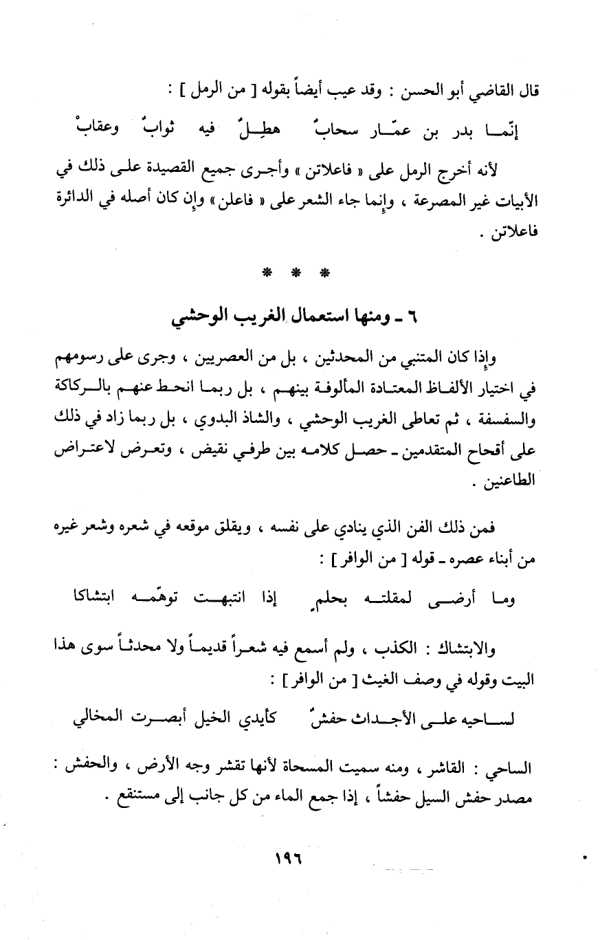 وَإِذا كَانَ المتنبي من الْمُحدثين بل من العصريين وَجرى على رسومهم فِي اخْتِيَار الْأَلْفَاظ الْمُعْتَادَة المألوفة بَينهم بل رُبمَا انحط عَنْهُم بالركاكة والسفسفة ثمَّ تعاطى الْغَرِيب الوحشي والشاذ البدوي بل رُبمَا زَاد فِي ذَلِك على أقحاح الْمُتَقَدِّمين حصل كَلَامه بَين طرفِي نقيض وَتعرض لاعتراض الطاعنين