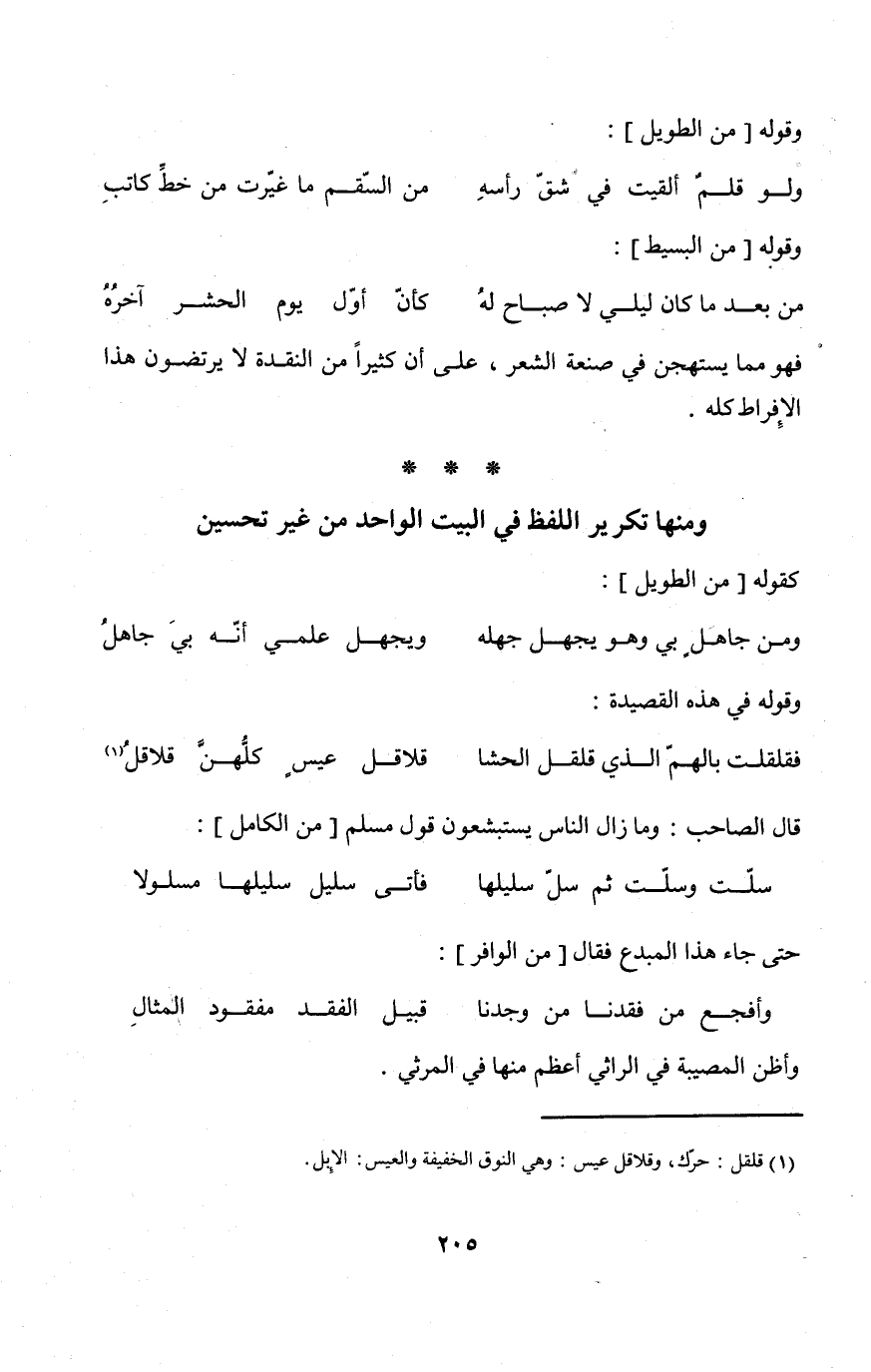 وَمِنْهَا تَكْرِير اللَّفْظ فِي الْبَيْت الْوَاحِد من غير تَحْسِين