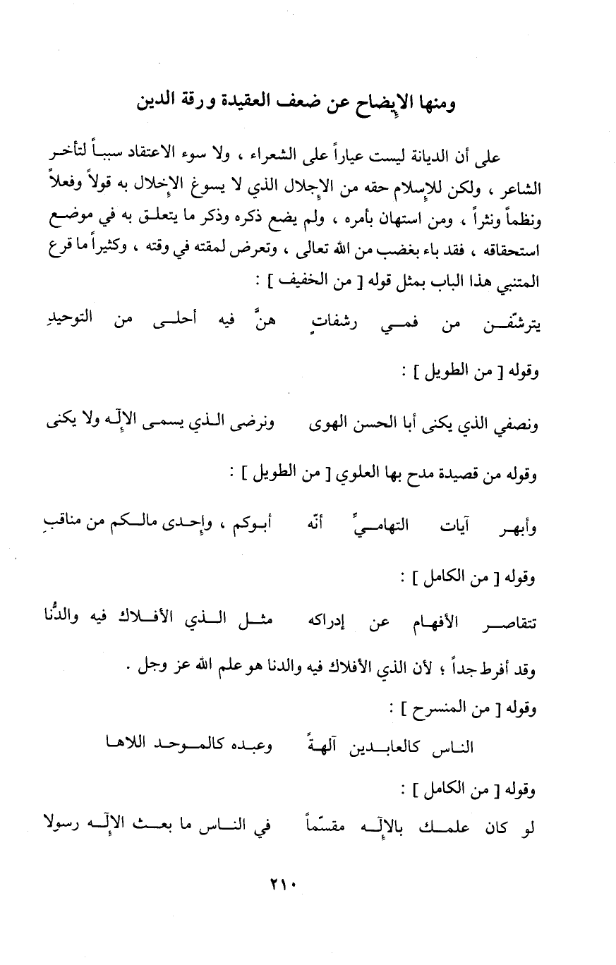 على أَن الدّيانَة لَيست عيارا على الشُّعَرَاء وَلَا سوء الِاعْتِقَاد سَببا لتأخر الشَّاعِر وَلَكِن لِلْإِسْلَامِ حَقه من الإجلال الَّذِي لَا يسوغ الْإِخْلَال بِهِ قولا وفعلا ونظما ونثرا وَمن استهان بأَمْره وَلم يضع ذكره وَذكر مَا يتَعَلَّق بِهِ فِي مَوضِع اسْتِحْقَاقه فقد بَاء بغضب من الله تَعَالَى وَتعرض لمقته فِي وقته وَكَثِيرًا مَا قرع المتنبي هَذَا الْبَاب بِمثل قَوْله