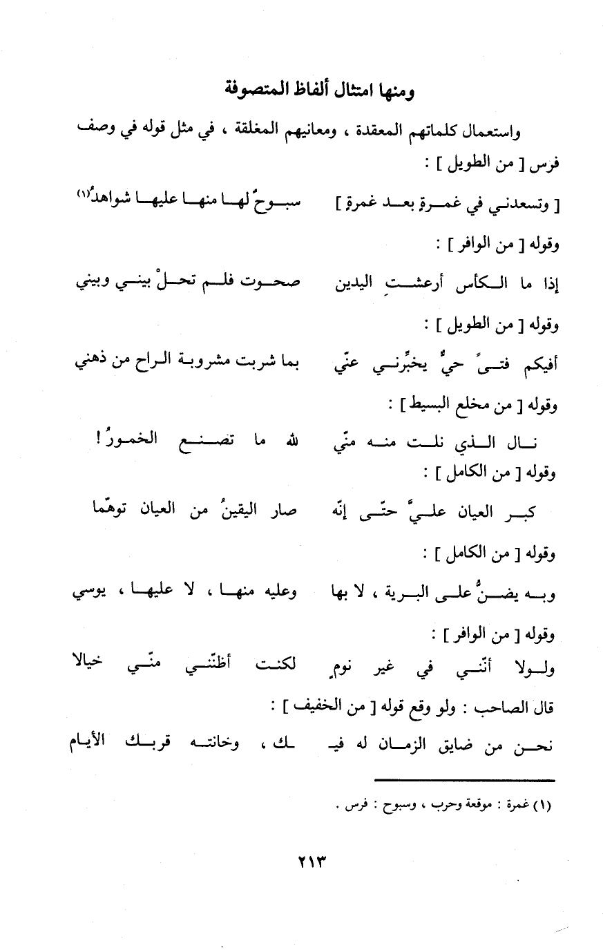 وَاسْتِعْمَال كلماتهم المعقدة ومعانيهم المغلقة فِي مثل قَوْله فِي وصف فرس