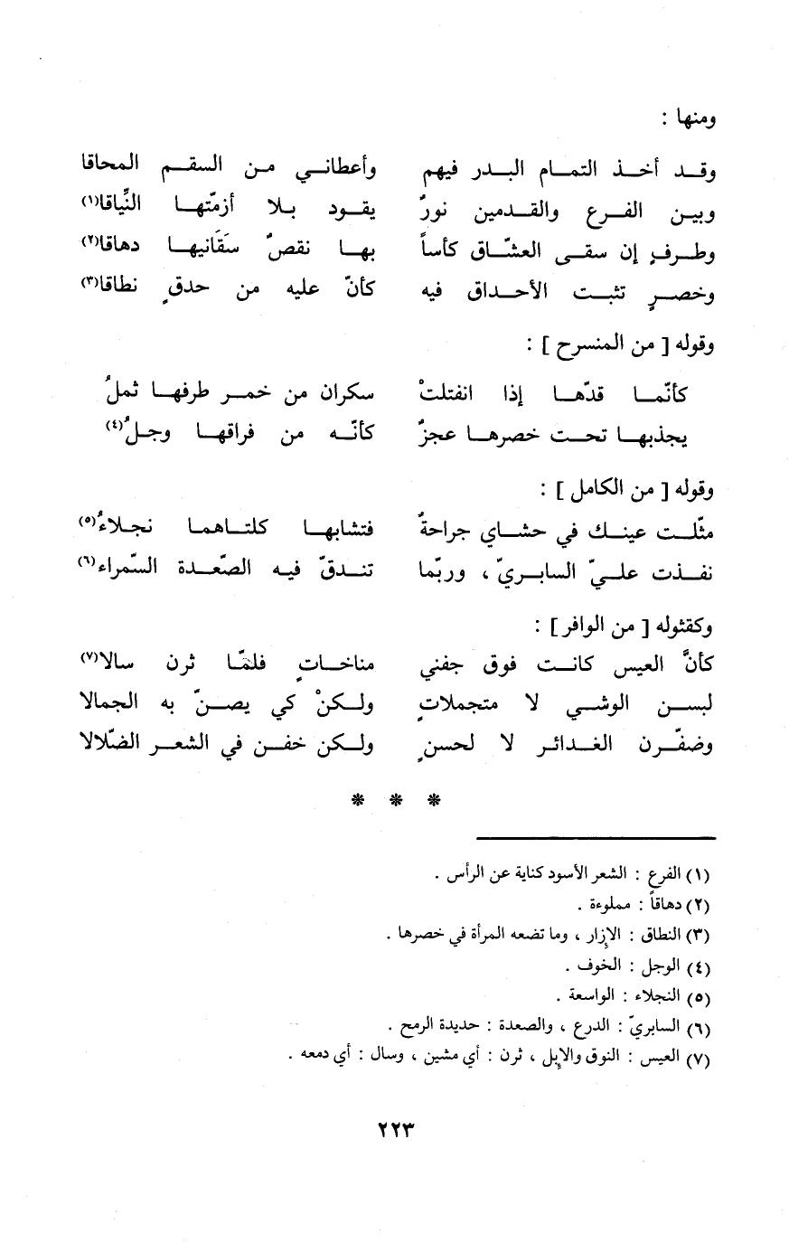 (مثلت عَيْنك فِي حشاي جِرَاحَة ... فتشابها كلتاهما نجلاء)
