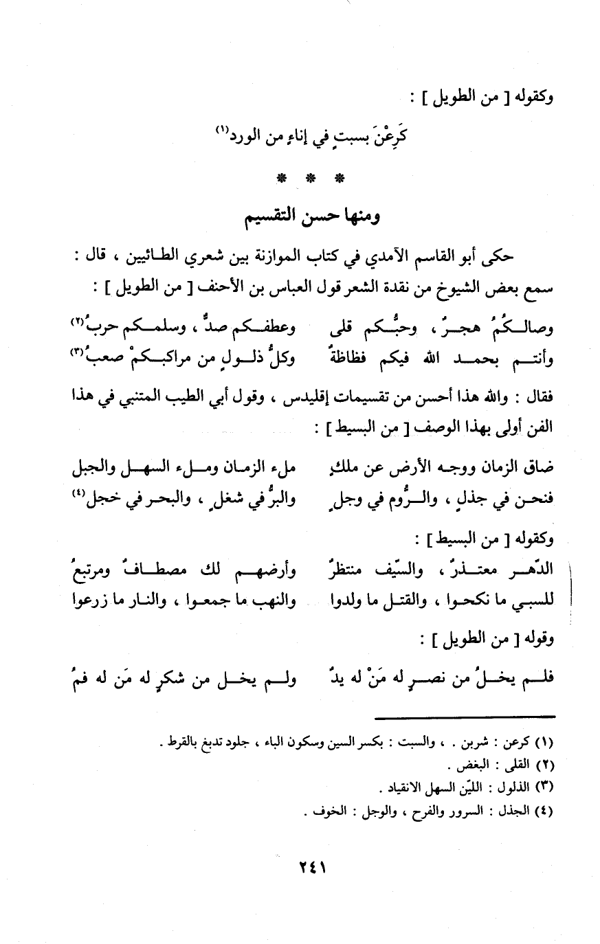 حكى أَبُو الْقَاسِم الْآمِدِيّ فِي كتاب الموازنة بَين شعري الطائيين قَالَ سمع بعض الشُّيُوخ من نقدة الشّعْر قَول الْعَبَّاس بن الْأَحْنَف