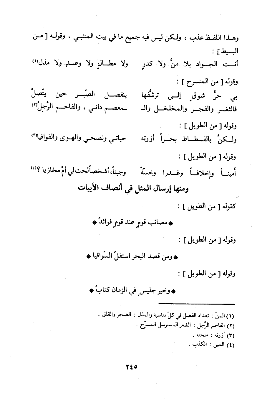 وَمِنْهَا إرْسَال الْمثل فِي أَنْصَاف الأبيات