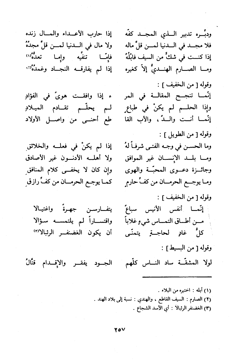 (فَلَا مجد فِي الدُّنْيَا لمن قل مَاله ... وَلَا مَال فِي الدُّنْيَا لمن قل مجده)