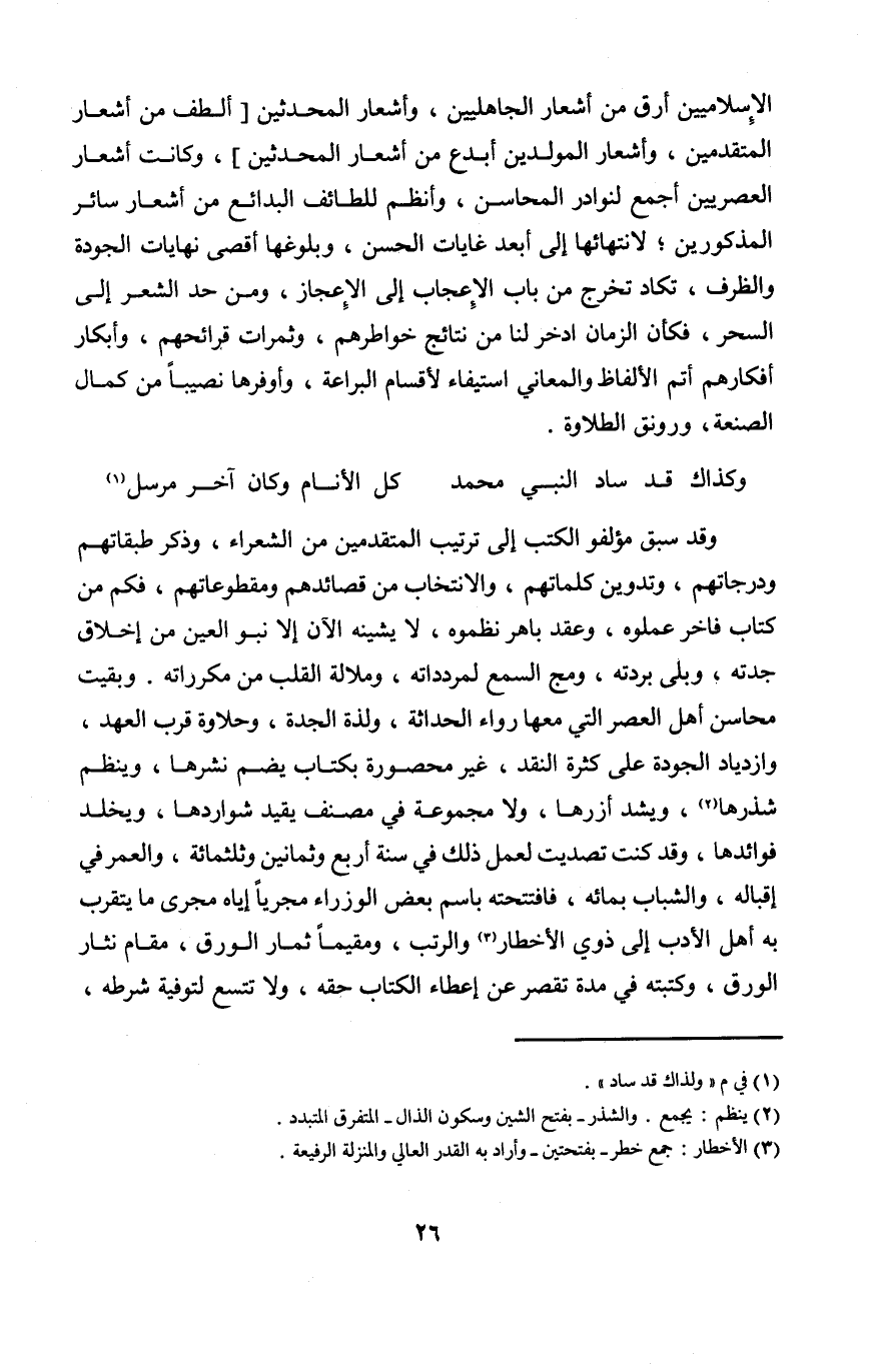 وَقد سبق مؤلفو الْكتب إِلَى تَرْتِيب الْمُتَقَدِّمين من الشُّعَرَاء وَذكر طبقاتهم ودرجاتهم وَتَدْوِين كلماتهم والانتخاب من قصائدهم ومقطوعاتهم فكم من كتاب فاخر عملوه وَعقد باهر نظموه لَا يشينه الْآن إِلَّا نبو الْعين من إخلاق جدته وبلى بردته وَمَج السّمع لمردداته وملالة الْقلب من مكرراته