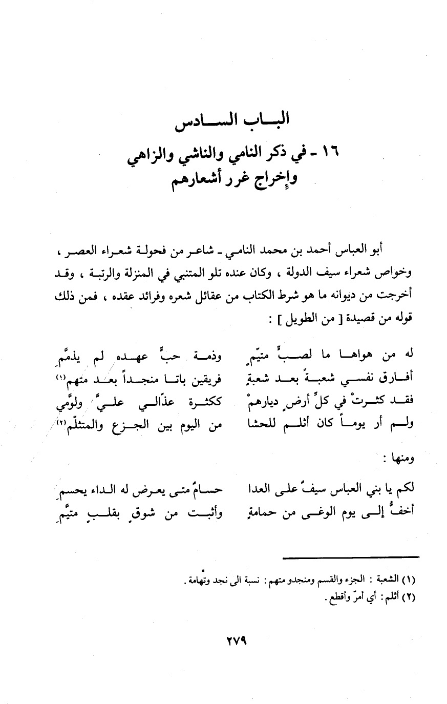أَبُو الْعَبَّاس أَحْمد بن مُحَمَّد النامي شَارِع من فحولة شعراء الْعَصْر وخواص شعراء سيف الدولة وَكَانَ عِنْده تلو المتنبي فِي الْمنزلَة والرتبة وَقد أخرجت من ديوانه مَا هُوَ شَرط الْكتاب من عقائل شعره وفرائد عقده فَمن ذَلِك قَوْله من قصيدة