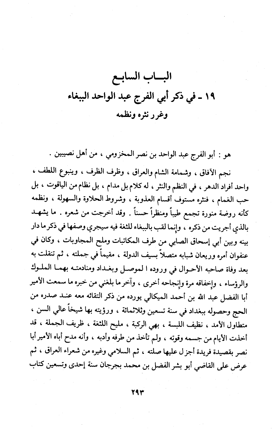 19 - فِي ذكر أبي الْفرج عبد الْوَاحِد الببغاء وغرر نثره ونظمه