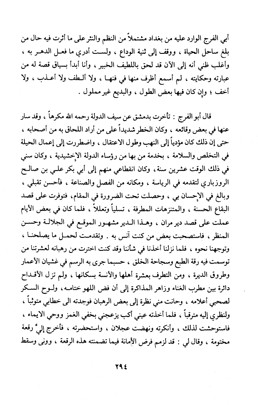 وَتَقَدَّمت لحمل مَا يُصْلِحنَا وتوجهنا نَحوه فَلَمَّا نزلنَا أَخذنَا فِي شَأْننَا وَقد كنت اخْتَرْت من رهبانه لعشرتنا من توسمت فِيهِ رقة الطَّبْع وسجاحة الْخلق حَسْبَمَا جرى بِهِ الرَّسْم فِي غشيان الْأَعْمَار وطروق الديرة وَمن التطرف بِعشْرَة أَهلهَا والأنسة بسكانها وَلم تزل الأقداح دَائِرَة بَين مطرب الْغناء وزاهر المذاكرة إِلَى أَن فض اللَّهْو ختامه ولوح السكر لصحبي أَعْلَامه وحانت مني نظرة إِلَى بعض الرهبان فَوَجَدته إِلَى خطابي متوثبا ولنظري إِلَيْهِ مترقبا فَلَمَّا أَخَذته عَيْني أكب يزعجني بخفي الغمز ووحي الْإِيمَاء فاستوحشت لذَلِك وأنكرته ونهضت عجلَان واستحضرته فَأخْرج إِلَيّ رقْعَة مختومة وَقَالَ لي قد لزمم فرض الْأَمَانَة فِيمَا تضمنته هَذِه الرقعة وونى وَسقط