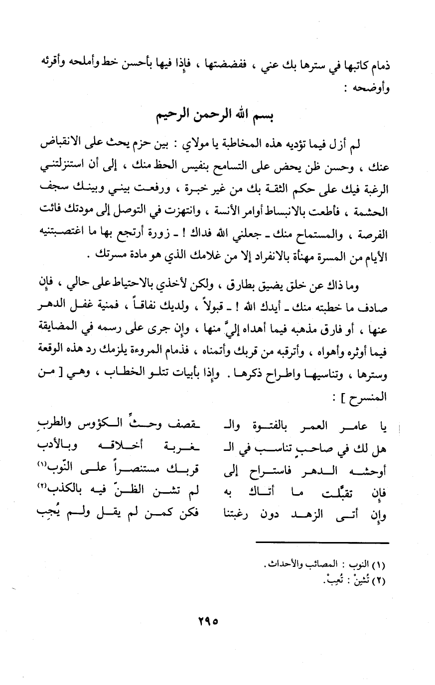 لم أزل فِيمَا تُؤَدِّيه هَذِه المخاطبة يَا مولَايَ بَين حزم يحث على الانقباض عَنْك وَحسن ظن يحض على التسامح بنفيس الْحَظ مِنْك إِلَى أَن استنزلتني الرَّغْبَة فِيك على حكم الثِّقَة بك من غير خبْرَة وَرفعت بيني وَبَيْنك سجف الحشمة فأطعت بالانبساط أوَامِر الأنسة وانتهزت فِي التَّوَصُّل إِلَى مودتك فَائت الفرصة والمستماح مِنْك جعلني الله فدَاك زورة أرتجع بهَا اغتصبتنيه الْأَيَّام من المسرة مهنأة بالانفراد إِلَّا من غلامك الَّذِي هُوَ مَادَّة مسرتك