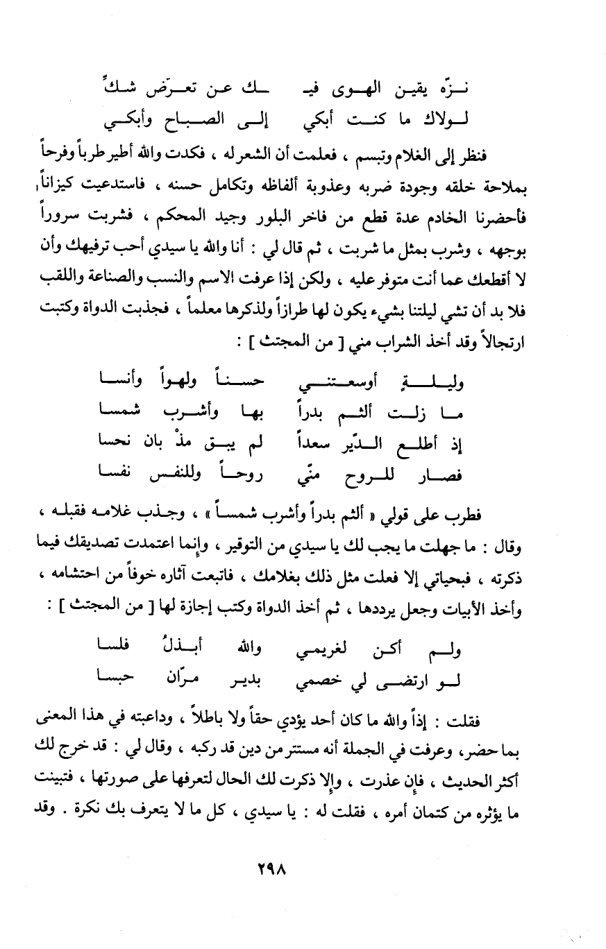 فَنظر إِلَى الْغُلَام وَتَبَسم فَعلمت أَن الشّعْر لَهُ فكدت وَالله أطير طَربا وفرحا بملاحة خلقه وجودة ضربه وعذوبة أَلْفَاظه وتكامل حسنه فاستدعيت كيزانا فأحضرنا الْخَادِم عدَّة قطع من فاخر البلور وجيد الْمُحكم فَشَرِبت سُرُورًا بِوَجْهِهِ وَشرب بِمثل مَا شربت ثمَّ قَالَ لي أَنا وَالله يَا سَيِّدي أحب ترفيهك وَأَن لَا أقطعك عَمَّا أَنْت متوفر عَلَيْهِ وَلَكِن إِذا عرفت الِاسْم وَالنّسب والصناعة واللقب فَلَا بُد أَن تشي ليلتنا بِشَيْء يكون لَهَا طرازا ولذكرها معلما فجذبت الدواة وكتبت ارتجالا وَقد أَخذ الشَّرَاب مني