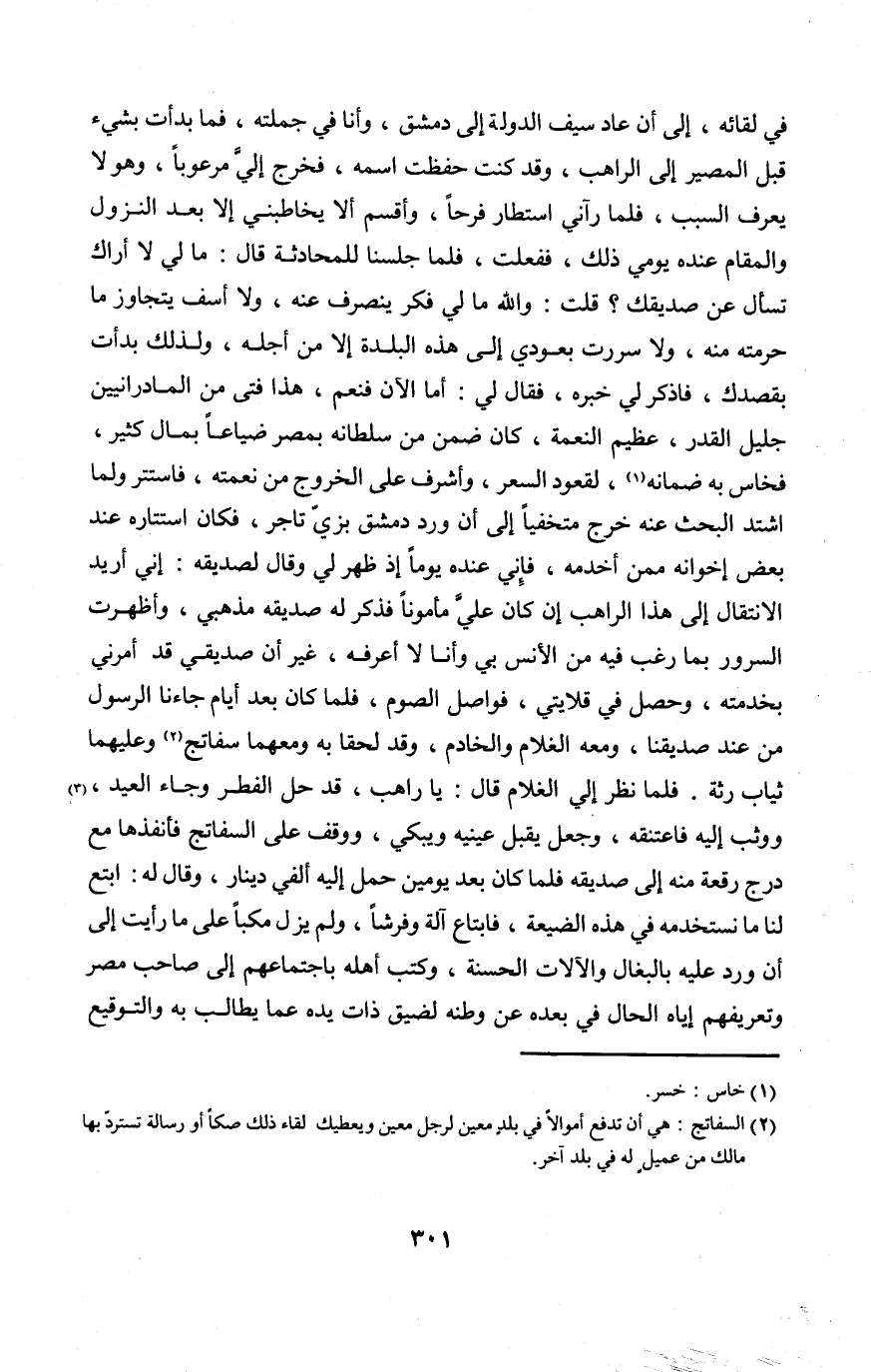 فِي لِقَائِه إِلَى أَن عَاد سيف الدولة إِلَى دمشق وَأَنا فِي جملَته فَمَا بدأت بِشَيْء قبل الْمصير إِلَى الراهب وَقد كنت حفظت اسْمه فَخرج إِلَيّ مَرْعُوبًا وَهُوَ لَا يعرف السَّبَب فَلَمَّا رَآنِي استطار فَرحا وَأقسم أَلا يخاطبني إِلَّا بعد النُّزُول وَالْمقَام عِنْده يومي ذَلِك فَفعلت فَلَمَّا جلسنا للمحادثة قَالَ مَا لي لَا أَرَاك تسْأَل عَن صديقك قلت وَالله مَا لي فكر ينْصَرف عَنهُ وَلَا أَسف يتَجَاوَز مَا حرمته مِنْهُ وَلَا سررت بعودي إِلَى هَذِه الْبَلدة إِلَّا من أَجله وَلذَلِك بدأت بقصدك فاذكر لي خَبره فَقَالَ لي أما الْآن فَنعم هَذَا فَتى من المادرانيين جليل الْقدر عَظِيم النِّعْمَة كَانَ ضمن من سُلْطَانه بِمصْر ضيَاعًا بِمَال كثير فخاس بِهِ ضَمَانه لقعود السّعر وأشرف على الْخُرُوج من نعْمَته فاستتر وَلما اشْتَدَّ الْبَحْث عَنهُ خرج متخفيا إِلَى أَن ورد دمشق بزِي تَاجر فَكَانَ استتاره عِنْد بعض إخوانه مِمَّن أخدمه فَإِنِّي عِنْده يَوْمًا إِذْ ظهر لي وَقَالَ لصديقه إِنِّي أُرِيد الِانْتِقَال إِلَى هَذَا الراهب إِن كَانَ عَليّ مَأْمُونا فَذكر لَهُ صديقه مذهبي وأظهرت السرُور بِمَا رغب فِيهِ من الْأنس بِي وَأَنا لَا أعرفهُ غير أَن صديقي قد أَمرنِي بخدمته وَحصل فِي قلايتي فواصل الصَّوْم فَلَمَّا كَانَ بعد أَيَّام جَاءَنَا الرَّسُول من عِنْد صديقنا وَمَعَهُ الْغُلَام وَالْخَادِم وَقد لَحقا بِهِ ومعهما سفاتج وَعَلَيْهِمَا ثِيَاب رثَّة