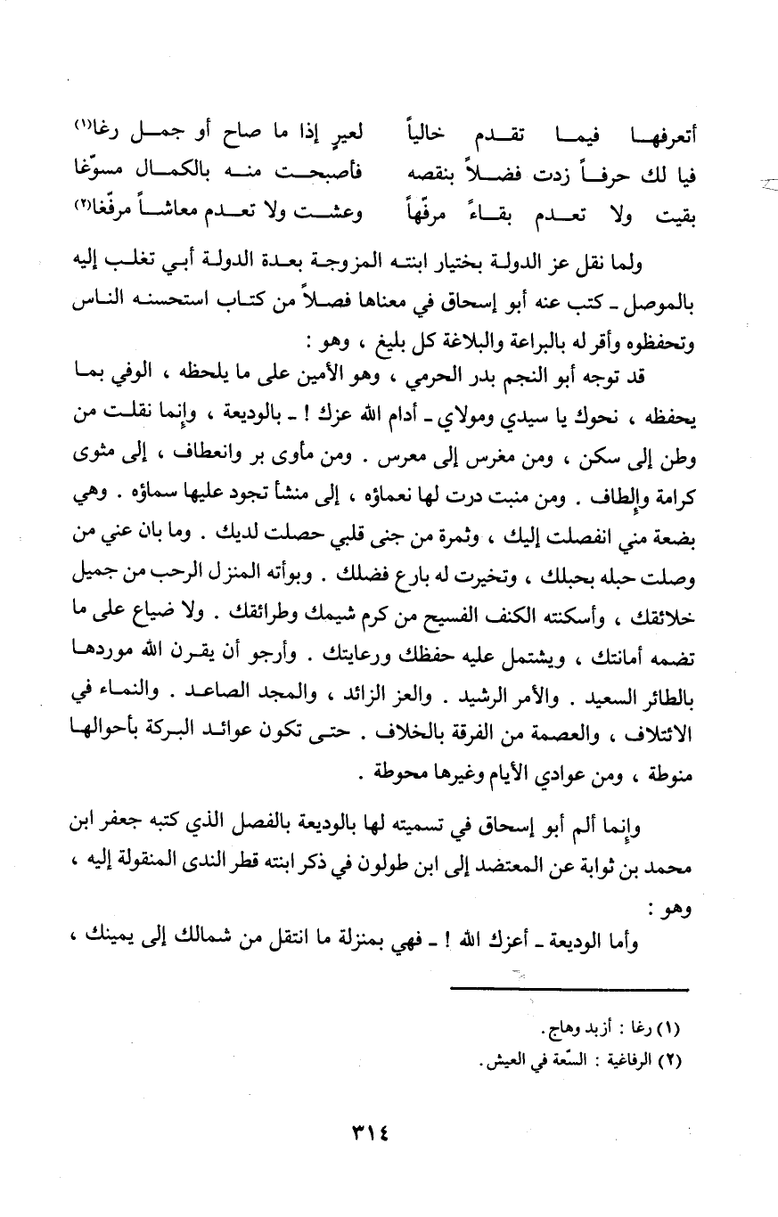 وَإِنَّمَا ألم أَبُو إِسْحَاق فِي تَسْمِيَته لَهَا بالوديعة بِالْفَصْلِ الَّذِي كتبه جَعْفَر ابْن مُحَمَّد بن ثوابة عَن المعتضد إِلَى ابْن طولون فِي ذكر ابْنَته قطر الندى المنقولة إِلَيْهِ وَهُوَ