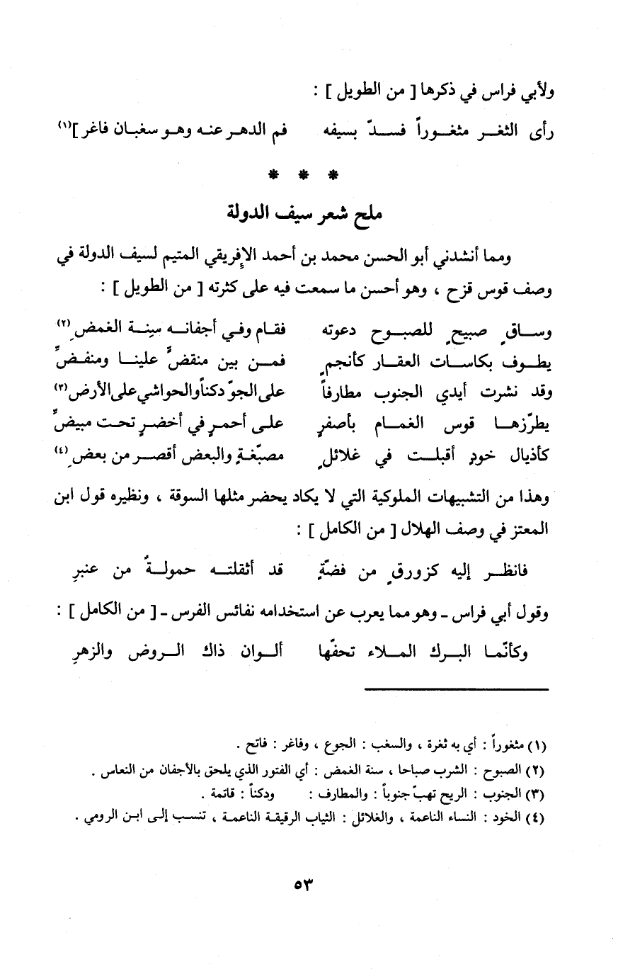 وَمِمَّا أَنْشدني أَبُو الْحسن مُحَمَّد بن أَحْمد الإفْرِيقِي المتيم لسيف الدولة فِي وصف قَوس قزَح وَهُوَ أحسن مَا سَمِعت فِيهِ على كثرته