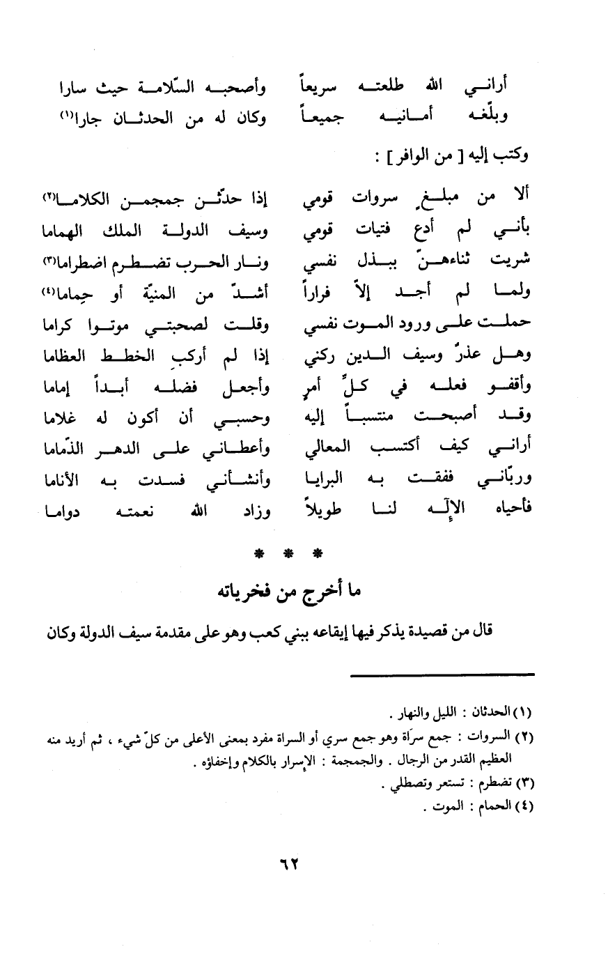 (بِأَنِّي لم أدع فتيات قومِي ... وَسيف الدولة الْملك الهماما)