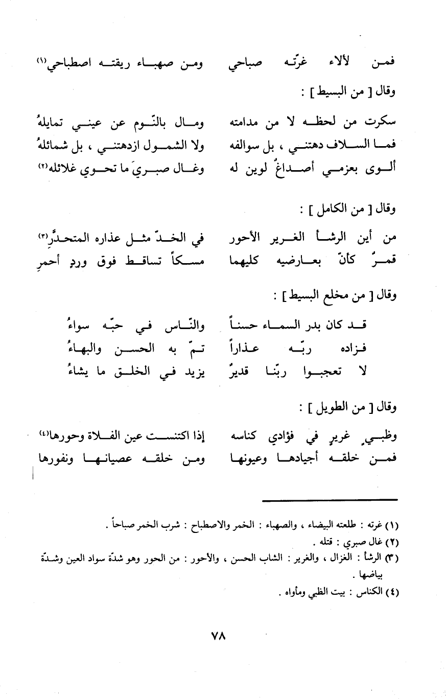 (قمر كَأَن بعارضيه كليهمَا ... مسكا تساقط فَوق ورد أَحْمَر) // من الْكَامِل //