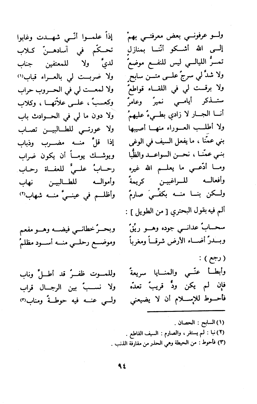 (وَلَا شدّ لي سرج على متن سابح ... وَلَا ضربت لي بالعراء قباب)