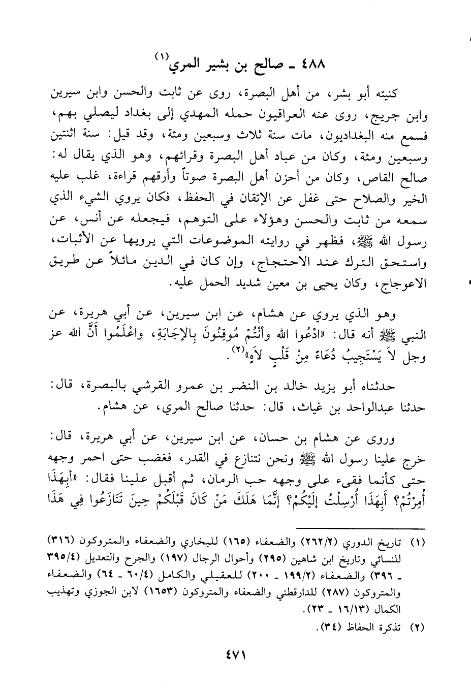 وهو الذي يروي عن هشام، عن ابن سيرين، عن أبي هريرة، عن النبي - صلى الله عليه وسلم - أنه قال: "ادْعُوا الله وأنْتُمْ مُوقِنُونَ بِالإجَابَةِ، وأعْلَمُوا أَنَّ الله عز وجل لَا يَسْتَجِيبُ دُعَاءً مِن قَلْبٍ لَاهٍ" (٢).