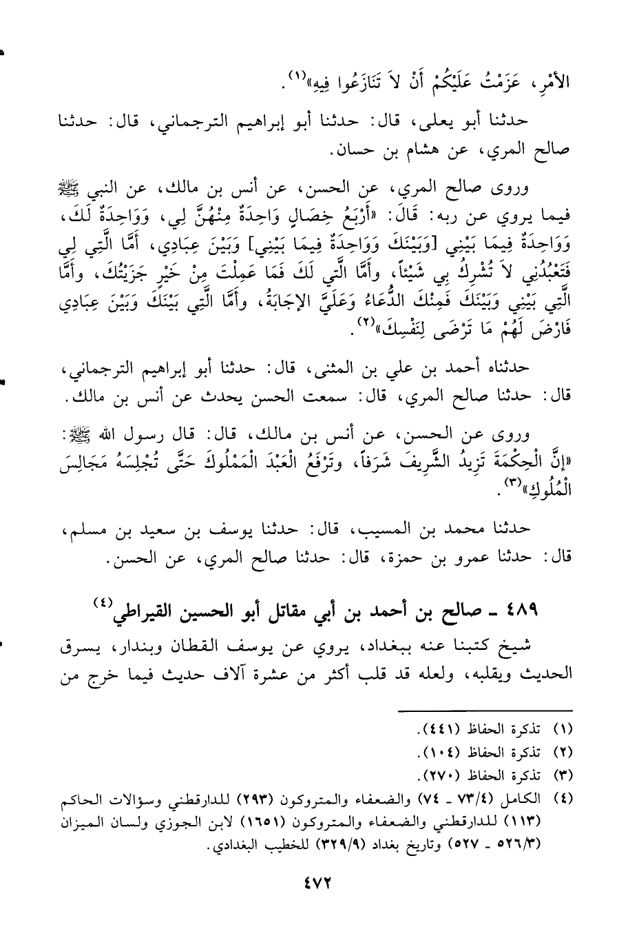 حدثناه أحمد بن علي بن المثنى، قال: حدثنا أبو إبراهيم الترجماني، قال: حدثنا صالح المري، قال: سمعت الحسن يحدث عن أنس بن مالك.