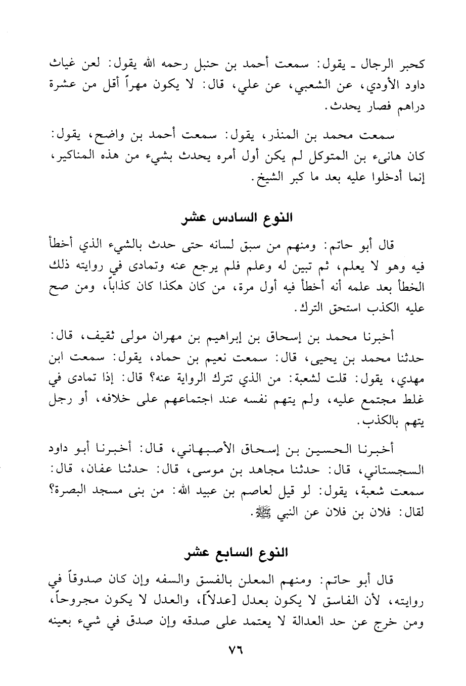 قال أبو حاتم: ومنهم المعلن بالفسق والسفه وَإن كان صدوقًا في روايته، لأن الفاسق لا يكون بعدل [عدلًا]، والعدل لا يكون مجروحًا، ومن خرج عن حد العدالة لا يعتمد على صدقه وإن صدق في شيء بعينه