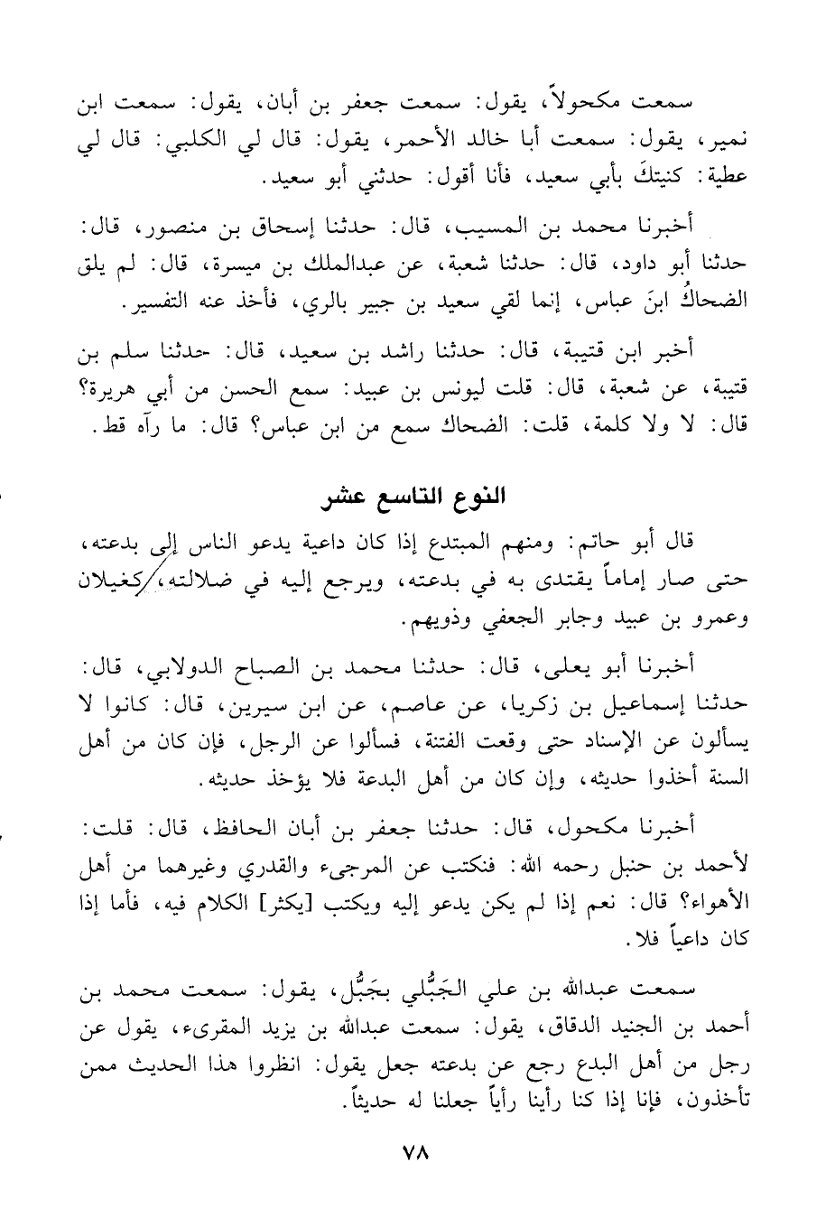 أخبرنا مكحول، قال: حدثنا جعفر بن أبان الحافظ، قال: قلت: لأحمد بن حنبل رحمه الله: فنكتب عن المرجىء والقدري وغيرهما من أهل الأهواء؟ قال: نعم إذا لم يكن يدعو إليه ويكتب [يكثر] الكلام فيه، ، فأما إذا كان داعيًا فلا.