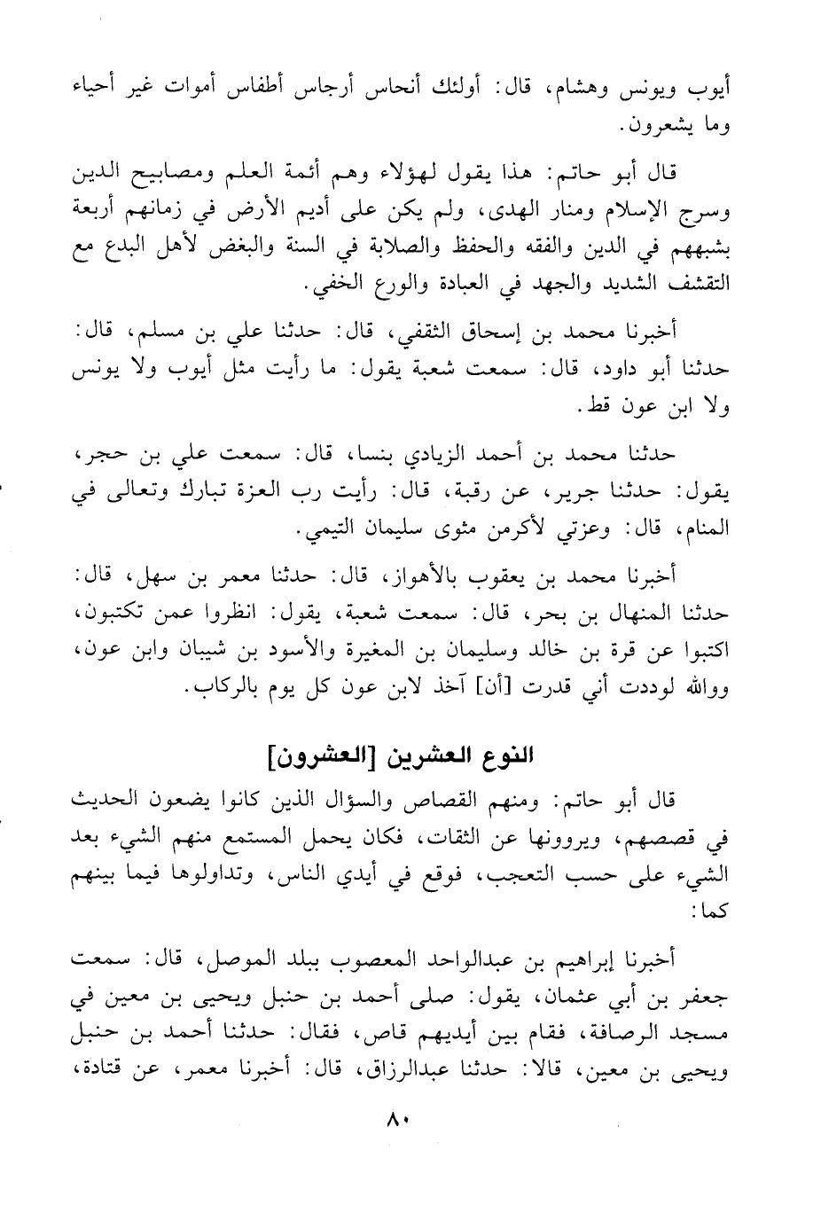 قال أبو حاتم: هذا يقول لهؤلاء وهم أئمة العلم ومصابيح الدين وسرج الإسلام ومنار الهدى، ولم يكن على أديم الأرض في زمانهم أربعة بشبههم في الدين والفقه والحفظ والصلابة في السنة والبغض لأهل البدع مع التقشف الشديد والجهد في العبادة والورع الخفي.