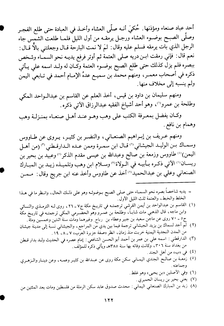 وَمِنْهُم عريف بن إِبْرَاهِيم الصَّنْعَانِيّ وَالنضْر بن كثير يروي عَن طَاوُوس وَسماك بن الْوَلِيد الجيشاني قَالَ ابْن سَمُرَة وَمِمَّنْ عده الدَّارَقُطْنِيّ من أهل الْيمن طَاوُوس وَزَمعَة بن صَالح وَعبد الله بن عِيسَى مقدم الذّكر وَعبيد بن بحير بن ريسان الْآتِي ذكره بِأَبِيهِ فِي الْوُلَاة وَسَلام ابْن وهب وتلميذه زيد بن الْمُبَارك الصَّنْعَانِيّ وعَلى بن عبد الحميد أَخذ عَن طَاوُوس وَأخذ عَنهُ ابْن جريج وَقَالَ مِمَّن