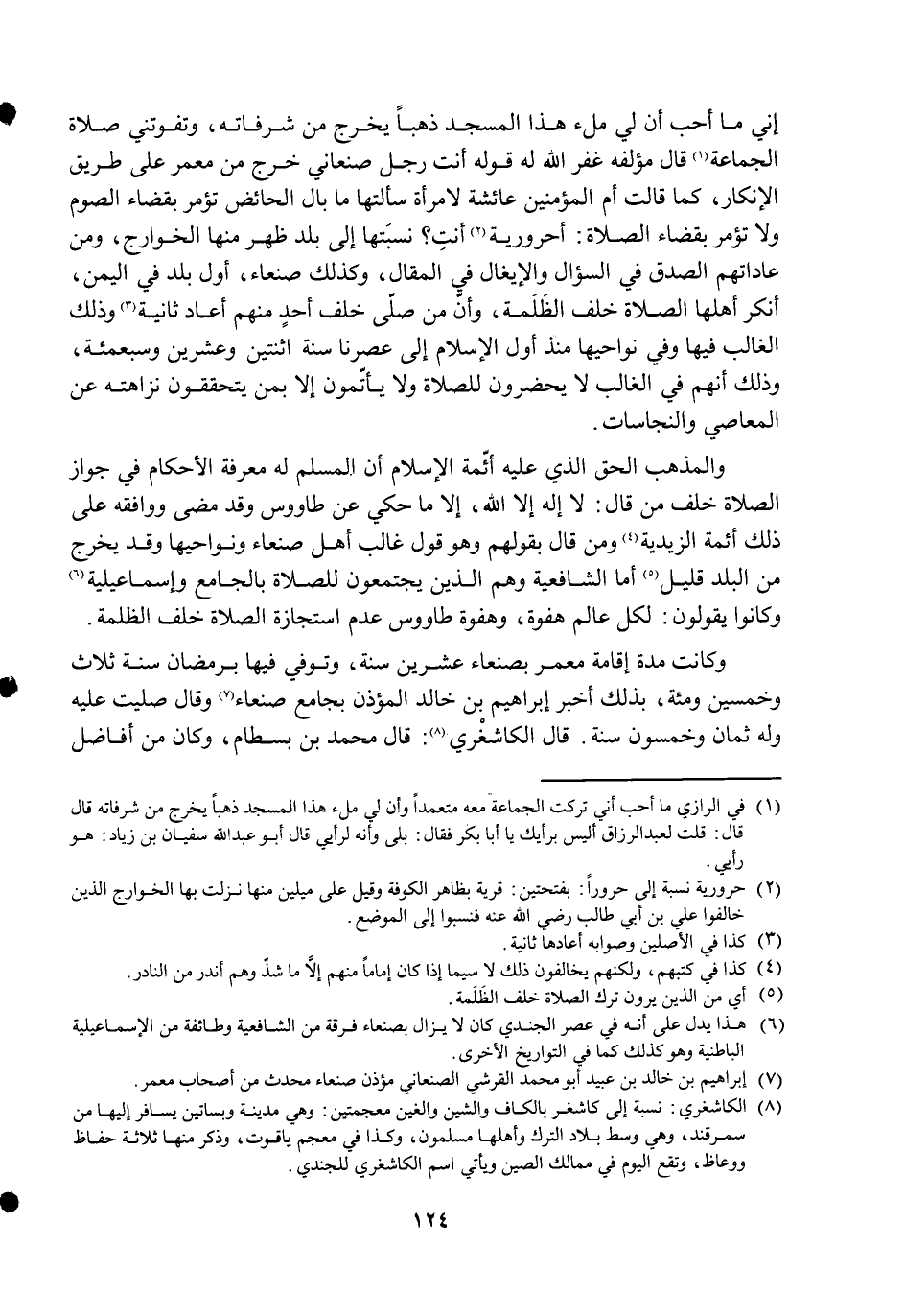 إِنِّي مَا أحب أَن لي ملْء هَذَا الْمَسْجِد ذَهَبا يخرج من شرفاته وتفوتني صَلَاة الْجَمَاعَة قَالَ مُؤَلفه غفر الله لَهُ قَوْله أَنْت رجل صنعاني خرج من معمر على طَرِيق الْإِنْكَار كَمَا قَالَت أم الْمُؤمنِينَ عَائِشَة لامْرَأَة سَأَلتهَا مَا بَال الْحَائِض تُؤمر بِقَضَاء الصَّوْم وَلَا تُؤمر بِقَضَاء الصَّلَاة أحرورية إنت نسبتها إِلَى بلد ظهر مِنْهَا الْخَوَارِج وَمن عاداتهم الصدْق فِي السُّؤَال والإيغال فِي الْمقَال وَكَذَلِكَ صنعاء أول بلد فِي الْيمن أنكر أَهلهَا الصَّلَاة خلف الظلمَة وَأَن من صلى خلف أحد مِنْهُم أعَاد ثَانِيَة وَذَلِكَ الْغَالِب فِيهَا وَفِي نَوَاحِيهَا مُنْذُ أول الْإِسْلَام إِلَى عصرنا سنة اثْنَتَيْنِ وَعشْرين وسبعمئة وَذَلِكَ أَنهم فِي الْغَالِب لَا يحْضرُون للصَّلَاة وَلَا يأتمون إِلَّا بِمن يتحققون نزاهته عَن الْمعاصِي والنجاسات
