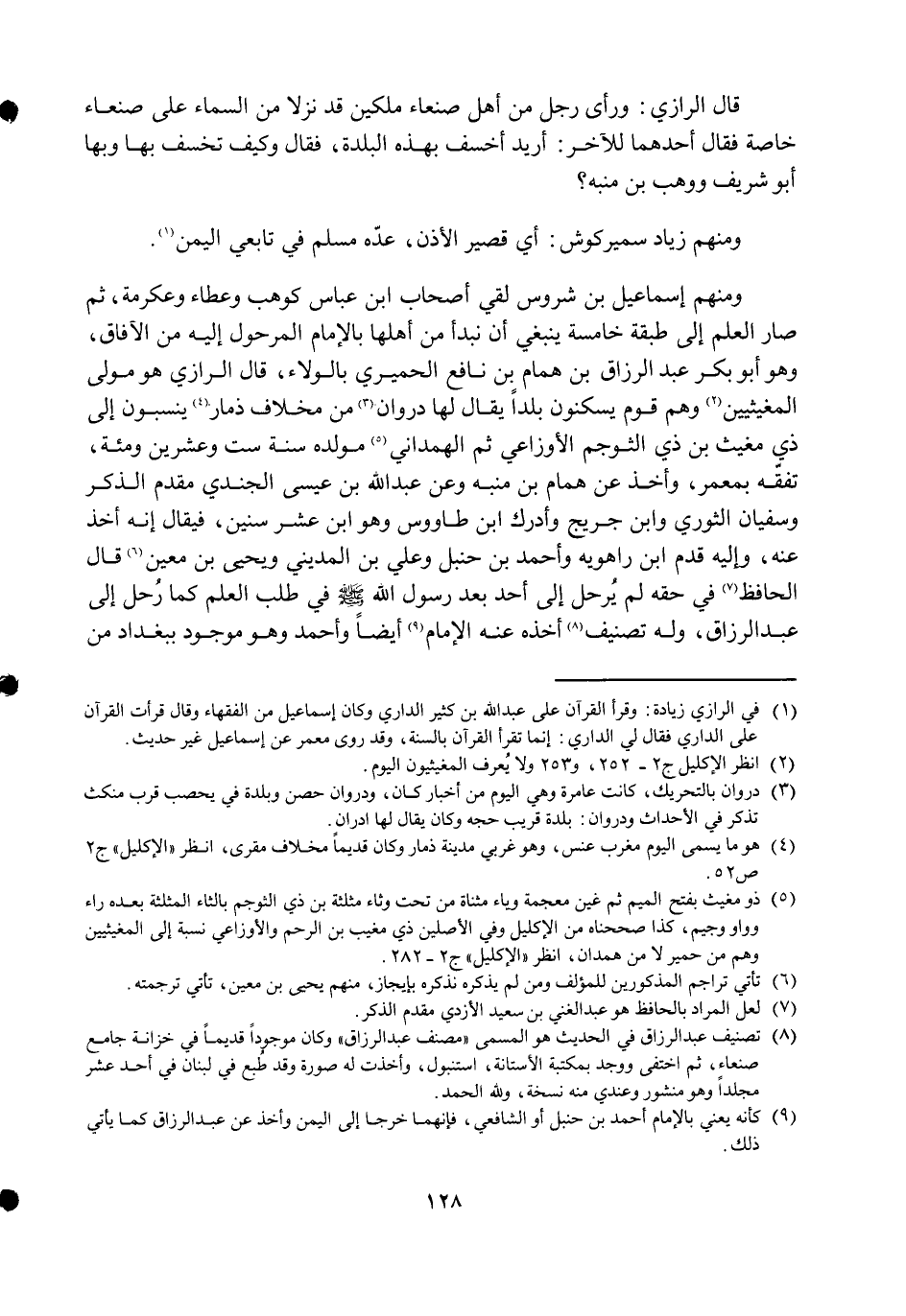 وَمِنْهُم إِسْمَاعِيل بن شروس لَقِي أَصْحَاب ابْن عَبَّاس كوهب وَعَطَاء وَعِكْرِمَة ثمَّ صَار الْعلم إِلَى طبقَة خَامِسَة يَنْبَغِي أَن نبدأ من أَهلهَا بِالْإِمَامِ المرحول إِلَيْهِ من الْآفَاق وَهُوَ أَبُو بكر عبد الرَّزَّاق بن همام بن نَافِع الْحِمْيَرِي بِالْوَلَاءِ قَالَ الرَّازِيّ هُوَ مولى المغيثيين وهم قوم يسكنون بَلَدا يُقَال لَهَا دروان من مخلاف ذمار ينسبون إِلَى ذِي مغيث بن ذِي الثوجم الْأَوْزَاعِيّ ثمَّ الْهَمدَانِي مولده سنة سِتّ وَعشْرين ومئة تفقه بِمَعْمَر وَأخذ عَن همام بن مُنَبّه وَعَن عبد الله بن عِيسَى الجندي مقدم الذّكر وسُفْيَان الثَّوْريّ وَابْن جريج وَأدْركَ ابْن طَاوُوس وَهُوَ ابْن عشر سِنِين فَيُقَال إِنَّه أَخذ عَنهُ وَإِلَيْهِ قدم ابْن رَاهَوَيْه وَأحمد بن حَنْبَل وَعلي بن الْمَدِينِيّ وَيحيى بن معِين قَالَ الْحَافِظ فِي حَقه لم يرحل إِلَى أحد بعد رَسُول الله صلى الله عَلَيْهِ وَسلم فِي طلب الْعلم كَمَا رَحل إِلَى عبد الرَّزَّاق وَله تصنيف أَخذه عَنهُ الإِمَام أَيْضا وَأحمد وَهُوَ مَوْجُود بِبَغْدَاد من