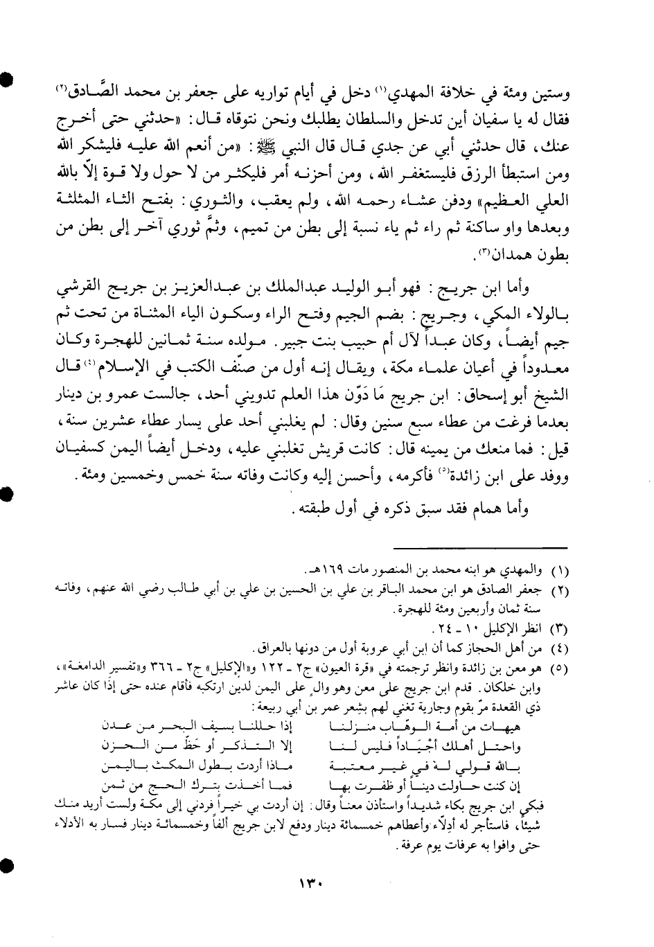 وَسِتِّينَ ومئة فِي خلَافَة الْمهْدي دخل فِي أَيَّام تواريه على جَعْفَر بن مُحَمَّد الصَّادِق فَقَالَ لَهُ يَا سُفْيَان أَيْن تدخل وَالسُّلْطَان يطلبك وَنحن نتوقاه قَالَ حَدثنِي حَتَّى أخرج عَنْك قَالَ حَدثنِي أبي عَن جدي قَالَ قَالَ النَّبِي صلى الله عَلَيْهِ وَسلم من أنعم الله عَلَيْهِ فليشكر الله وَمن استبطأ الرزق فليستغفر الله وَمن أحزنه أَمر فليكثر من لَا حول وَلَا قُوَّة إِلَّا بِاللَّه الْعلي الْعَظِيم وَدفن عشَاء رَحمَه الله وَلم يعقب وَالثَّوْري بِفَتْح الثَّاء الْمُثَلَّثَة وَبعدهَا وَاو سَاكِنة ثمَّ رَاء ثمَّ يَاء نِسْبَة إِلَى بطن من تَمِيم وَثمّ ثوري آخر إِلَى بطن من بطُون هَمدَان
