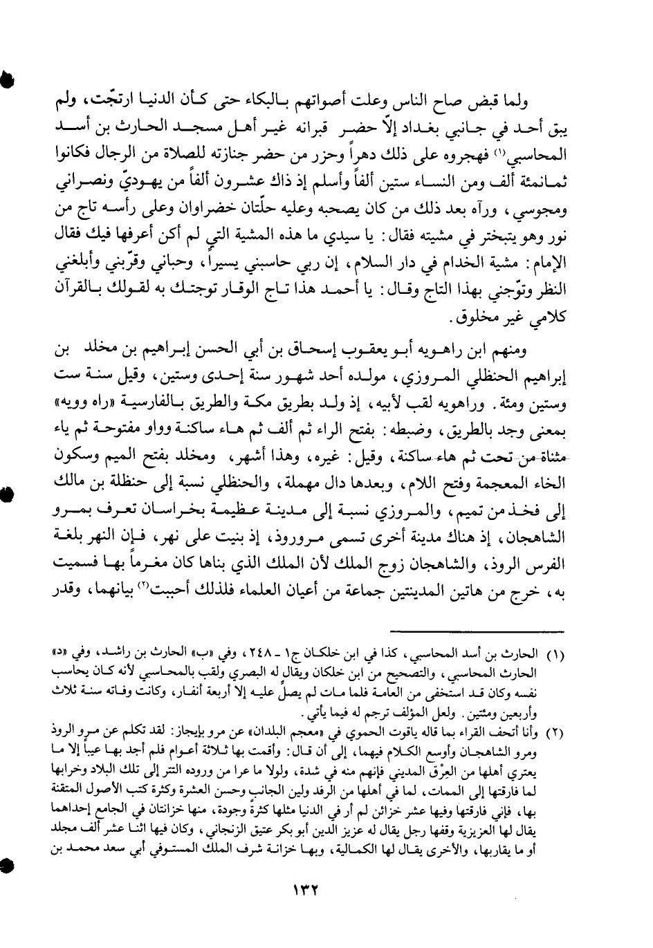 وَلما قبض صَاح النَّاس وعلت أَصْوَاتهم بالبكاء حَتَّى كَأَن الدُّنْيَا ارتجت وَلم يبْق أحد فِي جَانِبي بَغْدَاد إِلَّا حضر قبرانه غير أهل مَسْجِد الْحَارِث بن أَسد المحاسبي فهجروه على ذَلِك دهرا وحزر من حضر جنَازَته للصَّلَاة من الرِّجَال فَكَانُوا ثمانمئة ألف من النِّسَاء سِتِّينَ ألفا وَأسلم إِذْ ذَاك عشرُون ألفا من يَهُودِيّ وَنَصْرَانِي ومجوسي وَرَآهُ بعد ذَلِك من كَانَ يَصْحَبهُ وَعَلِيهِ حلتان خضراوان وعَلى رَأسه تَاج من نور وَهُوَ يتبختر فِي مشيته فَقَالَ يَا سَيِّدي مَا هَذِه المشية الَّتِي لم أكن أعرفهَا فِيك فَقَالَ الإِمَام مشْيَة الخدام فِي دَار السَّلَام إِن رَبِّي حاسبني يَسِيرا وحباني وقربني وأبلغني النّظر وتوجني بِهَذَا التَّاج وَقَالَ يَا أَحْمد هَذَا تَاج الْوَقار توجتك بِهِ لِقَوْلِك بِالْقُرْآنِ كَلَامي غير مَخْلُوق