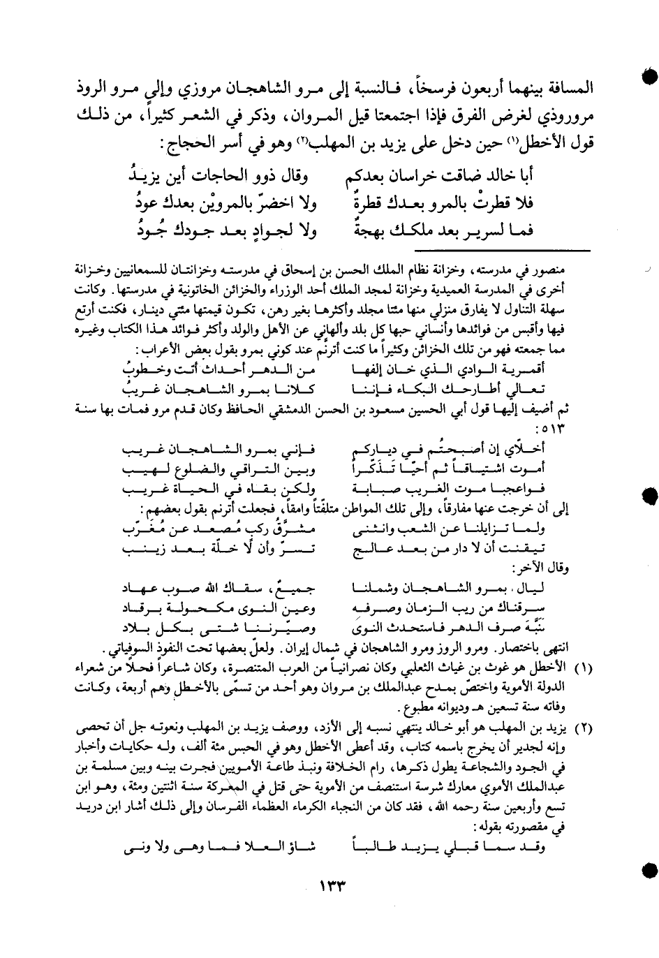 الْمسَافَة بَينهمَا أَرْبَعُونَ فرسخا فالنسبة إِلَى مرو الشاهجان مروزي وَإِلَى مرو الروذ مروروذي لغَرَض الْفرق فَإِذا اجتمعتا قيل المروان وَذكر فِي الشّعْر كثيرا من ذَلِك قَول الأخطل حِين دخل على يزِيد بن الْمُهلب وَهُوَ فِي أسر الْحجَّاج ... أَبَا خَالِد ضَاقَتْ خُرَاسَان بعدكم ... وَقَالَ ذَوُو الْحَاجَات أَيْن يزِيد