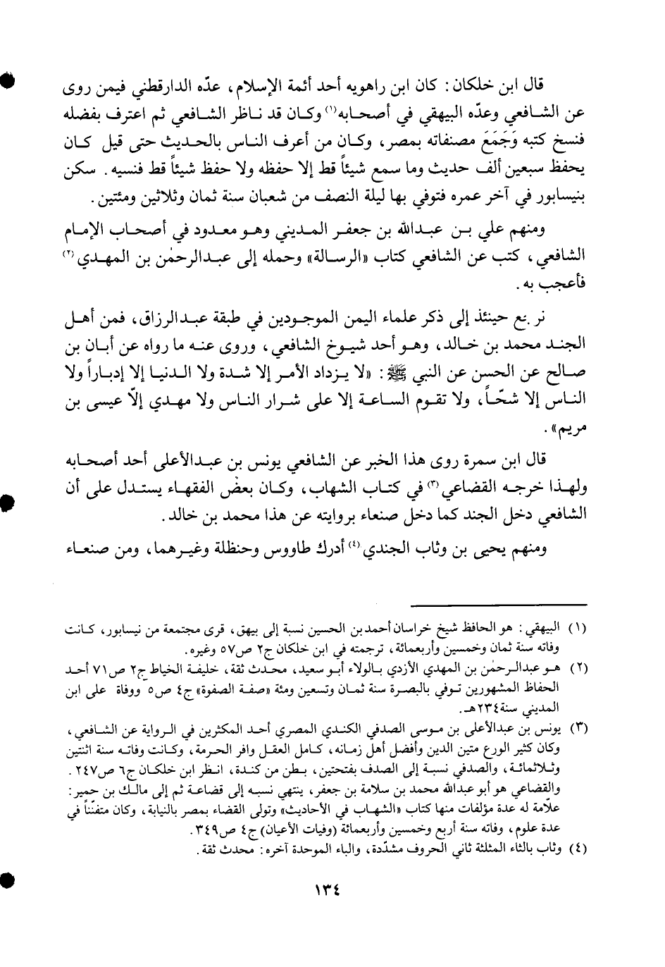 وَمِنْهُم عَليّ بن عبد الله بن جَعْفَر الْمَدِينِيّ وَهُوَ مَعْدُود فِي أَصْحَاب الإِمَام الشَّافِعِي كتب عَن الشَّافِعِي كتاب الرسَالَة وَحمله إِلَى عبد الرَّحْمَن بن الْمهْدي فأعجب بِهِ