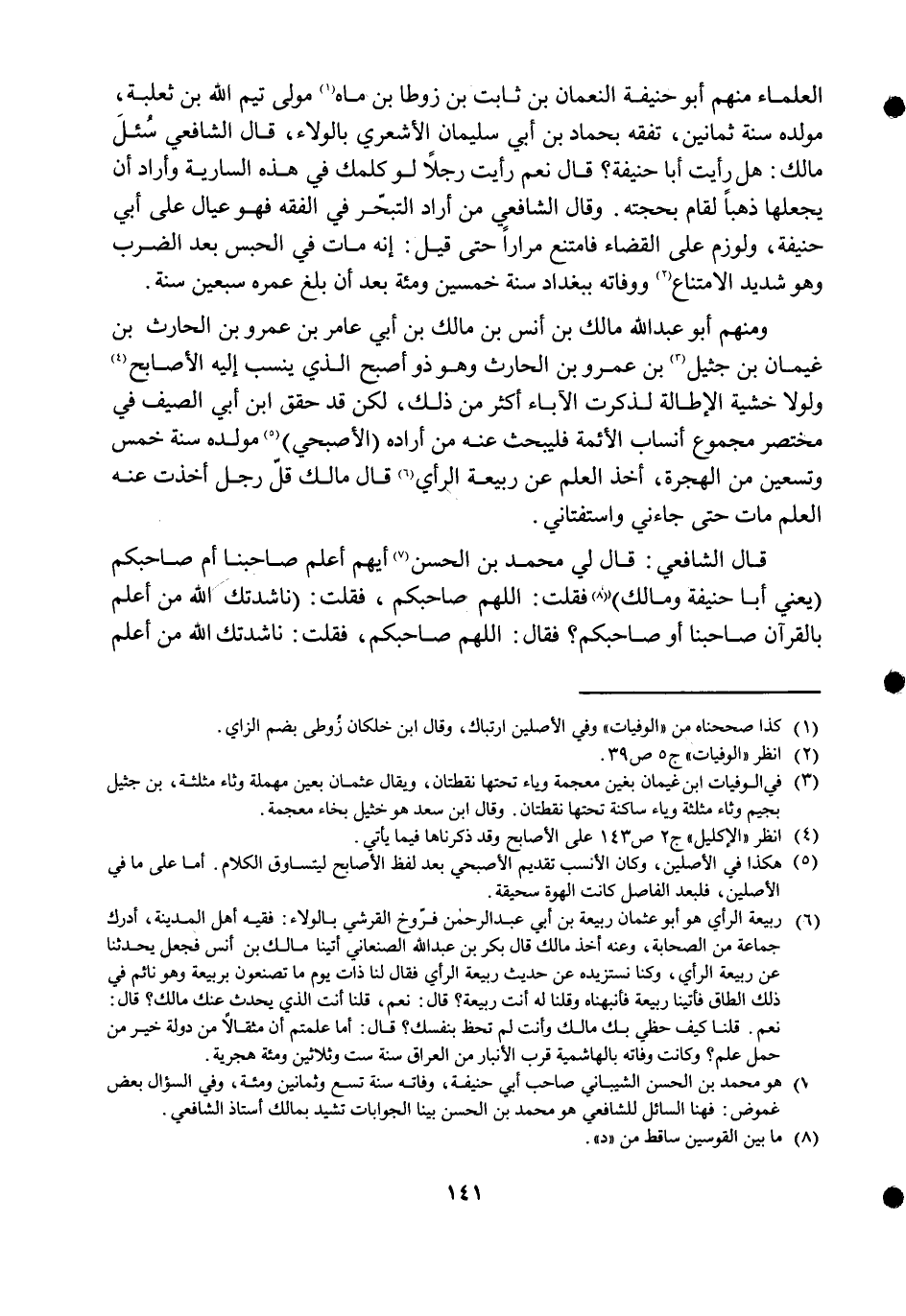الْعلمَاء مِنْهُم أَبُو حنيفَة النُّعْمَان بن ثَابت بن زوطا بن ماه مولى تيم الله بن ثَعْلَبَة مولده سنة ثَمَانِينَ تفقه بحماد بن أبي سُلَيْمَان الْأَشْعَرِيّ بِالْوَلَاءِ قَالَ الشَّافِعِي سُئِلَ مَالك هَل رَأَيْت أَبَا حنيفَة قَالَ نعم رَأَيْت رجلا لَو كلمك فِي هَذِه السارية وَأَرَادَ أَن يَجْعَلهَا ذَهَبا لقام بحجته