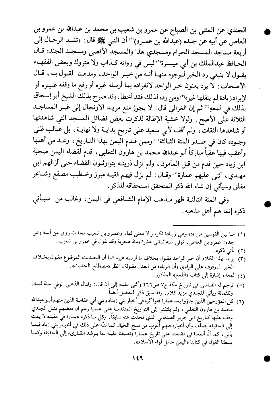 الجندي عَن الْمثنى بن الصَّباح عَن عَمْرو بن شُعَيْب بن مُحَمَّد بن عبد الله بن عَمْرو بن الْعَاصِ عَن أَبِيه عَن جده عبد الله بن عَمْرو أَن النَّبِي صلى الله عَلَيْهِ وَسلم قَالَ تشد الرّحال إِلَى أَرْبَعَة مَسَاجِد الْمَسْجِد الْحَرَام ومسجدي هَذَا وَالْمَسْجِد الْأَقْصَى وَمَسْجِد الْجند قَالَ الْحَافِظ عبد الْملك بن أبي ميسرَة لَيْسَ فِي رُوَاته كَذَّاب وَلَا مَتْرُوك وَبَعض الْفُقَهَاء يَقُول لَا يَنْبَغِي رد الْخَبَر لوجوه مِنْهَا أَنه من خبر الْوَاحِد ومذهبنا القَوْل بِهِ قَالَ الْأَصْحَاب لَا يرد يعنون خبر الْوَاحِد لانفراده بِمَا أرْسلهُ غَيره أَو رفع مَا وَقفه غَيره أَو لإيراد زِيَادَة لم ينقلها غَيره وَمن رده لذَلِك فقد أَخطَأ وَقد صرح بذلك الشَّيْخ أَبُو إِسْحَاق بذلك فِي لمعه ثمَّ إِن الْغَزالِيّ قَالَ لَا يجوز منع مُرِيد الارتحال إِلَى غير الْمَسَاجِد الثَّلَاثَة على الْأَصَح