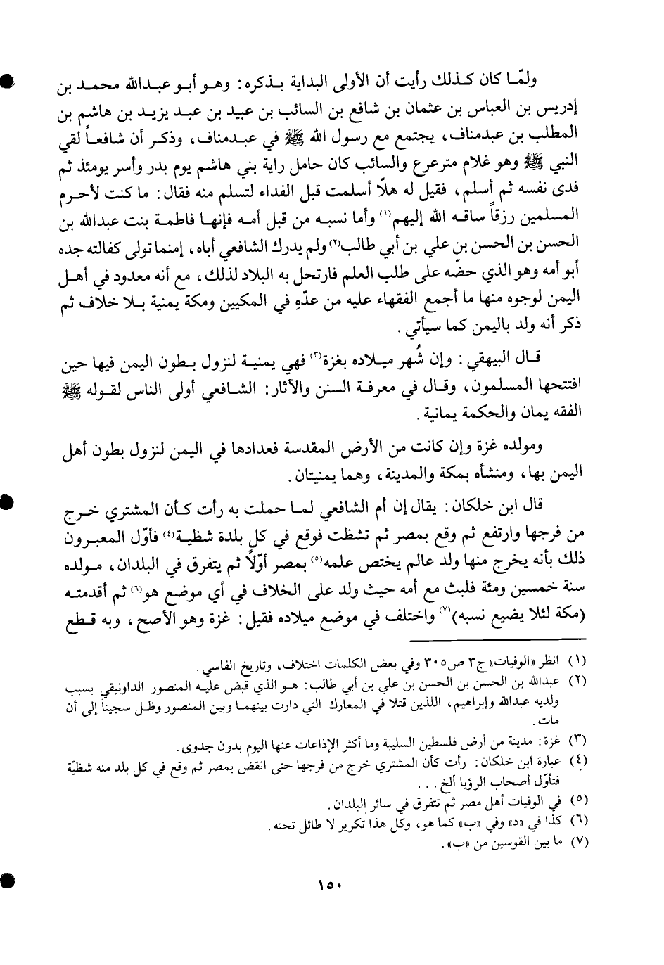 وَلما كَانَ كَذَلِك رَأَيْت أَن الأولى الْبِدَايَة بِذكرِهِ وَهُوَ أَبُو عبد الله مُحَمَّد بن إِدْرِيس بن الْعَبَّاس بن عُثْمَان بن شَافِع بن السَّائِب بن عبيد بن عبد يزِيد بن هَاشم بن الْمطلب بن عبد منَاف يجْتَمع مَعَ رَسُول الله صلى الله عَلَيْهِ وَسلم فِي عبد منَاف وَذكر أَن شافعا لَقِي النَّبِي صلى الله عَلَيْهِ وَسلم وَهُوَ غُلَام مترعرع والسائب كَانَ حَامِل راية بني هَاشم يَوْم بدر وَأسر يَوْمئِذٍ ثمَّ فدى نَفسه ثمَّ أسلم فَقيل لَهُ هلا أسلمت قبل الْفِدَاء لتسلم مِنْهُ فَقَالَ مَا كنت لأحرم الْمُسلمين رزقا سَاقه الله إِلَيْهِم وَأما نسبه من قبل أمه فَإِنَّهَا فَاطِمَة بنت عبد الله بن الْحسن بن الْحسن بن عَليّ بن أبي طَالب وَلم يدْرك الشَّافِعِي أَبَاهُ إمنما تولى كفَالَته جده أَبُو أمه وَهُوَ الَّذِي حضه على طلب الْعلم فارتحل بِهِ الْبِلَاد لذَلِك مَعَ أَنه مَعْدُود فِي أهل الْيمن لوجوه مِنْهَا مَا أجمع الْفُقَهَاء عَلَيْهِ من عدَّة فِي المكيين وَمَكَّة يمنية بِلَا خلاف ثمَّ ذكر أَنه ولد بِالْيمن كَمَا سَيَأْتِي