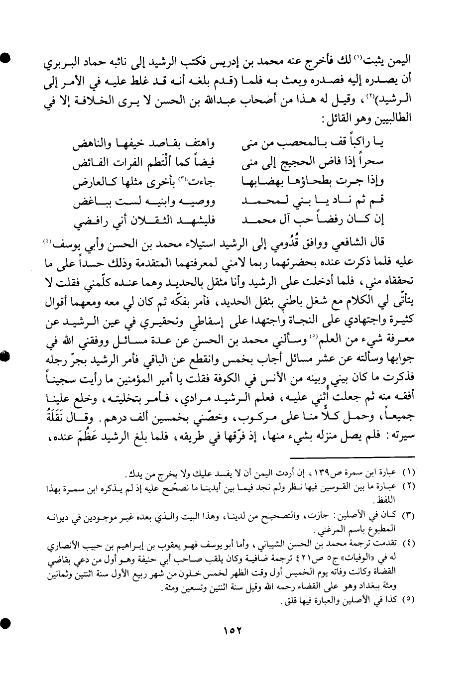 الْيمن يثبت لَك فَأخْرج عَنهُ مُحَمَّد بن إِدْرِيس فَكتب الرشيد إِلَى نَائِبه حَمَّاد الْبَرْبَرِي أَن يصدره إِلَيْهِ فصدره وَبعث بِهِ فَلَمَّا قدم بلغه أَنه قد غلط عَلَيْهِ فِي الْأَمر إِلَى الرشيد وَقيل لَهُ هَذَا من أَصْحَاب عبد الله بن الْحسن لَا يرى الْخلَافَة إِلَّا فِي الطالبيين وَهُوَ الْقَائِل ... يَا رَاكِبًا قف بالمحصب من منى ... واهتف بقاصد خيفها والناهض