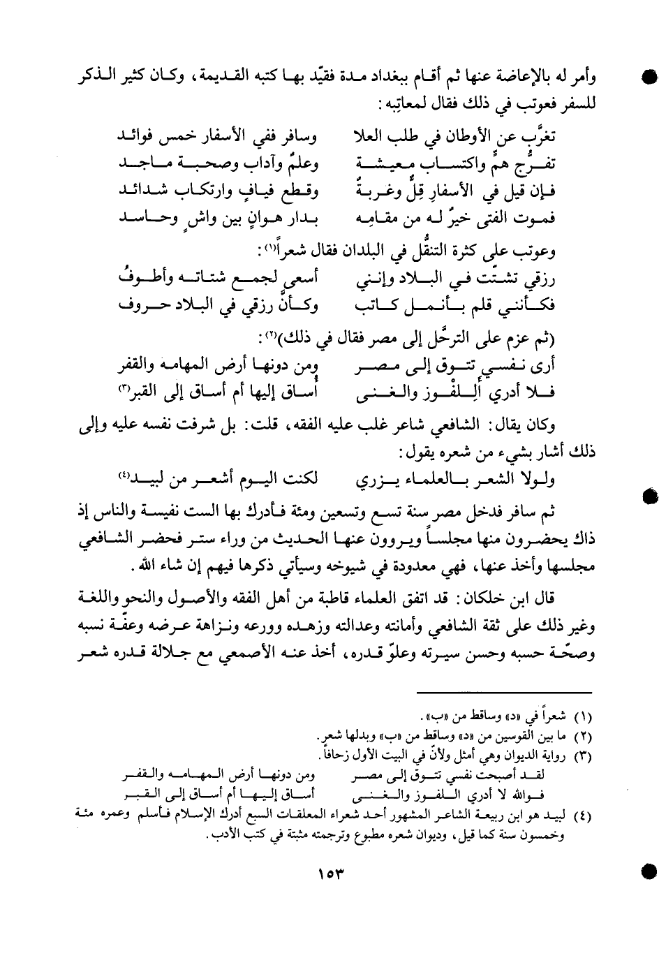 فَلَا أَدْرِي أللفوز والغنى ... أساق إِلَيْهَا أم أساق إِلَى الْقَبْر ... وَكَانَ يُقَال الشَّافِعِي شَاعِر غلب عَلَيْهِ الْفِقْه قلت بل شرفت نَفسه عَلَيْهِ وَإِلَى ذَلِك أَشَارَ بِشَيْء من شعره يَقُول ... وَلَوْلَا الشّعْر بالعلماء يزري ... لَكُنْت الْيَوْم أشعر من لبيد ... ثمَّ سَافر فَدخل مصر سنة تسع وَتِسْعين ومئة فَأدْرك بهَا السِّت نفيسة وَالنَّاس إِذْ ذَاك يحْضرُون مِنْهَا مَجْلِسا ويروون عَنْهَا الحَدِيث من وَرَاء ستر فَحَضَرَ الشَّافِعِي مجلسها وَأخذ عَنْهَا فَهِيَ مَعْدُودَة فِي شُيُوخه وَسَيَأْتِي ذكرهَا فيهم إِن شَاءَ الله