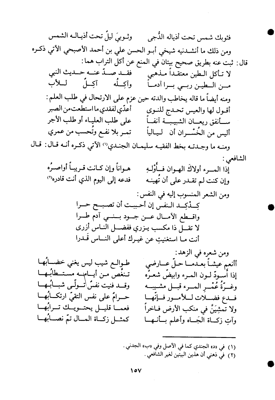 أَلَيْسَ من الخسران أَن لياليا ... تمر بِلَا نفع وتحسب من عمري ... وَمِنْه مَا وجدته بِخَط الْفَقِيه سُلَيْمَان الجندي الْآتِي ذكره أَنه قَالَ قَالَ الشَّافِعِي ... إِذا الْمَرْء أولاك الهوان فأوله ... هوانا وَإِن كَانَت قَرِيبا أواصره
