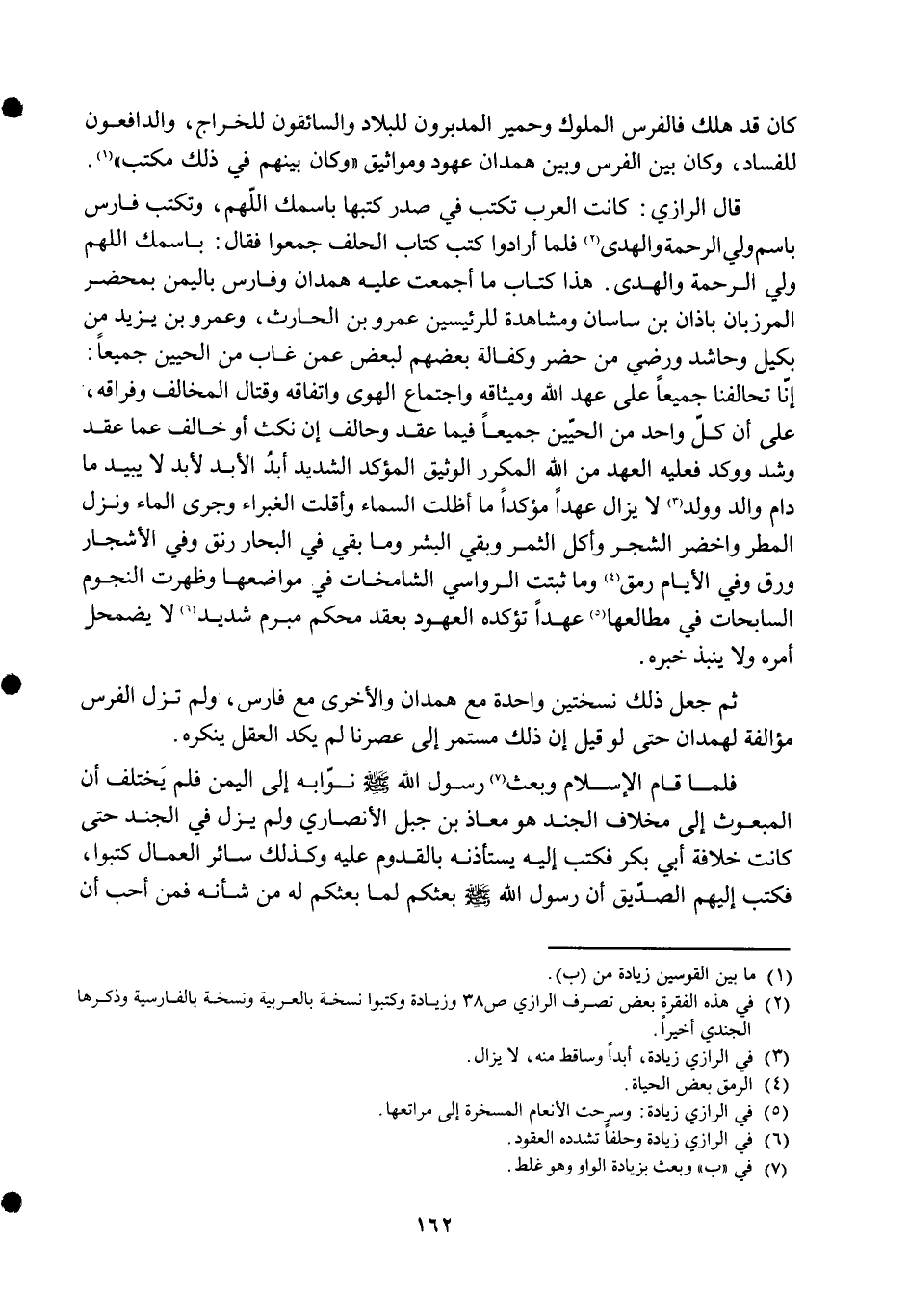 ثمَّ جعل ذَلِك نسختين وَاحِدَة مَعَ هَمدَان وَالْأُخْرَى مَعَ فَارس وَلم تزل الْفرس مؤالفة لهمدان حَتَّى لَو قيل إِن ذَلِك مُسْتَمر إِلَى عصرنا لم يكد الْعقل يُنكره
