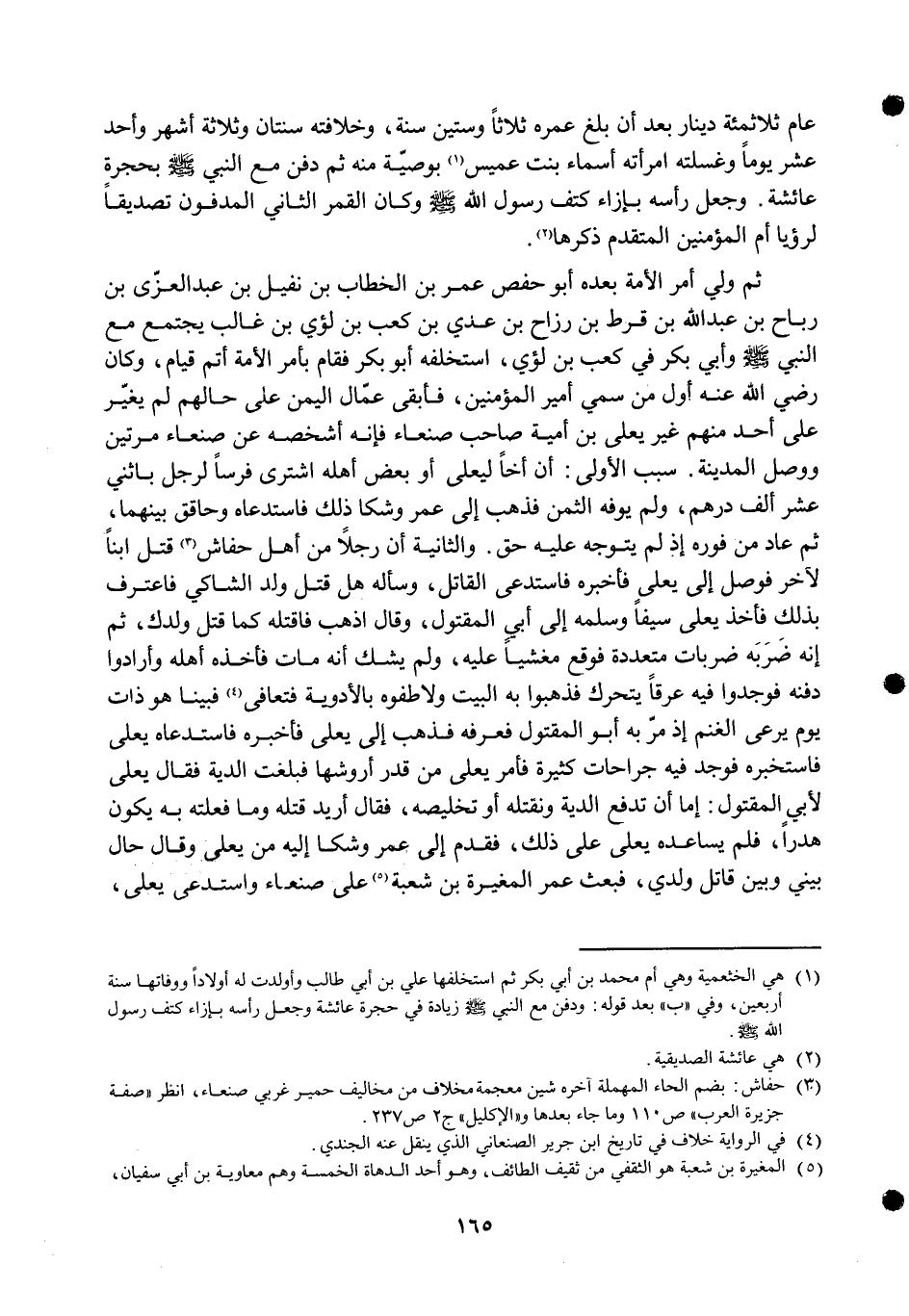 وَالثَّانيَِة أَن رجلا من أهل حفاش قتل ابْنا لآخر فوصل إِلَى يعلى فَأخْبرهُ فاستدعى الْقَاتِل وَسَأَلَهُ هَل قتل ولد الشاكي فاعترف بذلك فَأخذ يعلى سَيْفا وَسلمهُ إِلَى أبي الْمَقْتُول وَقَالَ اذْهَبْ فاقتله كَمَا قتل ولدك ثمَّ إِنَّه ضربه ضربات مُتعَدِّدَة فَوَقع مغشيا عَلَيْهِ وَلم يشك أَنه مَاتَ فَأَخذه أَهله وَأَرَادُوا دَفنه فوجدوا فِيهِ عرقا يَتَحَرَّك فَذَهَبُوا بِهِ الْبَيْت ولاطفوه بالأدوية فتعافى فَبينا هُوَ ذَات يَوْم يرْعَى الْغنم إِذْ مر بِهِ أَبُو الْمَقْتُول فَعرفهُ فَذهب إِلَى يعلى فَأخْبرهُ فاستدعاه يعلى فاستخبره فَوجدَ فِيهِ جراحات كَثِيرَة فَأمر يعلى من قدر أروشها فبلغت الدِّيَة فَقَالَ يعلى لأبي الْمَقْتُول إِمَّا أَن تدفع الدِّيَة ونقتله أَو تخليصه فَقَالَ أُرِيد قَتله وَمَا فعلته بِهِ يكون هدرا فَلم يساعده يعلى على ذَلِك فَقدم إِلَى عمر وشكا إِلَيْهِ من يعلى وَقَالَ حَال بيني وَبَين قَاتل وَلَدي فَبعث عمر الْمُغيرَة بن شُعْبَة على صنعاء واستدعى يعلى