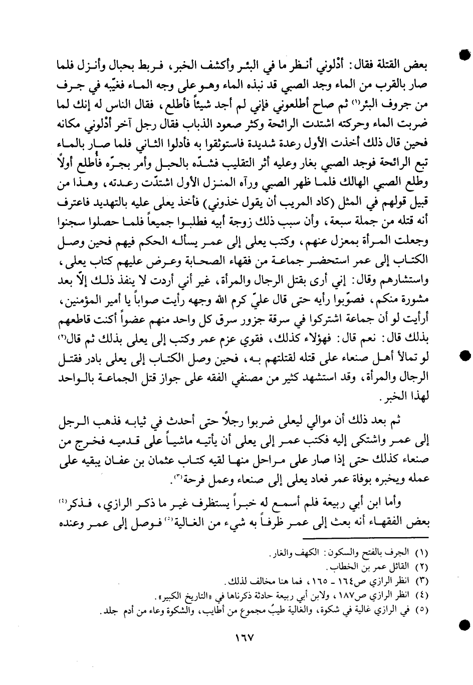 بعض القتلة فَقَالَ أدلوني أنظر مَا فِي الْبِئْر وأكشف الْخَبَر فَربط بحبال وَأنزل فَلَمَّا صَار بِالْقربِ من المَاء وجد الصَّبِي قد نبذه المَاء وَهُوَ على وَجه المَاء فغيبه فِي جرف من جروف الْبِئْر ثمَّ صَاح أطلعوني فَإِنِّي لم أجد شَيْئا فَأطلع فَقَالَ النَّاس لَهُ إِنَّك لما ضربت المَاء وحركته اشتدت الرَّائِحَة وَكثر صعُود الذُّبَاب فَقَالَ رجل آخر أدلوني مَكَانَهُ فحين قَالَ ذَلِك أخذت الأول رعدة شَدِيدَة فاستوثقوا بِهِ فأدلوا الثَّانِي فَلَمَّا صَار بِالْمَاءِ تبع الرَّائِحَة فَوجدَ الصَّبِي بِغَار وَعَلِيهِ أثر التقليب فشده بالحبل وَأمر بجره فَأطلع أَولا وطلع الصَّبِي الْهَالِك فَلَمَّا ظهر الصَّبِي وَرَآهُ الْمنزل الأول اشتدت رعدته وَهَذَا من قبيل قَوْلهم فِي الْمثل كَاد الْمُرِيب أَن يَقُول خذوني فَأخذ يعلى عَلَيْهِ بالتهديد فاعترف أَنه قَتله من جملَة سَبْعَة وَأَن سَبَب ذَلِك زَوْجَة أَبِيه فطلبوا جَمِيعًا فَلَمَّا حصلوا سجنوا وَجعلت الْمَرْأَة بمعزل عَنْهُم وَكتب يعلى إِلَى عمر يسْأَله الحكم فيهم فحين وصل الْكتاب إِلَى عمر استحضر جمَاعَة من فُقَهَاء الصَّحَابَة وَعرض عَلَيْهِم كتاب يعلى واستشارهم وَقَالَ إِنِّي أرى بقتل الرِّجَال وَالْمَرْأَة غير أَنِّي أردْت لَا ينفذ ذَلِك إِلَّا بعد مشورة مِنْكُم فصوبوا رَأْيه حَتَّى قَالَ عَليّ كرم الله وَجهه رَأَيْت صَوَابا يَا أَمِير الْمُؤمنِينَ أَرَأَيْت لَو أَن جمَاعَة اشْتَركُوا فِي سَرقَة جزور سرق كل وَاحِد مِنْهُم عضوا أَكنت قاطعهم بذلك قَالَ نعم قَالَ فَهَؤُلَاءِ كَذَلِك فقوي عزم عمر وَكتب إِلَى يعلى بذلك ثمَّ قَالَ لَو تمالأ أهل صنعاء على قَتله لقتلتهم بِهِ فحين وصل الْكتاب إِلَى يعلى بَادر فَقتل الرِّجَال وَالْمَرْأَة وَقد اسْتشْهد كثير من مصنفي الْفِقْه على جَوَاز قتل الْجَمَاعَة بِالْوَاحِدِ لهَذَا الْخَبَر