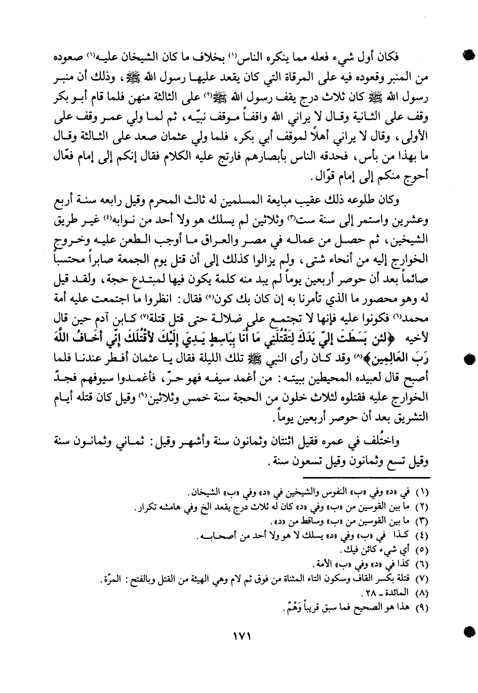 وَكَانَ طلوعه ذَلِك عقيب مبايعة الْمُسلمين لَهُ ثَالِث الْمحرم وَقيل رابعه سنة أَربع وَعشْرين وَاسْتمرّ إِلَى سنة سِتّ وَثَلَاثِينَ لم يسْلك هُوَ وَلَا أحد من نوابه غير طَرِيق الشَّيْخَيْنِ ثمَّ حصل من عماله فِي مصر وَالْعراق مَا أوجب الطعْن عَلَيْهِ وَخُرُوج الْخَوَارِج إِلَيْهِ من أنحاء شَتَّى وَلم يزَالُوا كَذَلِك إِلَى أَن قتل يَوْم الْجُمُعَة صَابِرًا محتسبا صَائِما بعد أَن حوصر أَرْبَعِينَ يَوْمًا لم يبد مِنْهُ كلمة يكون فِيهَا لمبتدع حجَّة وَلَقَد قيل لَهُ وَهُوَ مَحْصُور مَا الَّذِي تَأْمُرنَا بِهِ إِن كَانَ بك كَون فَقَالَ انْظُرُوا مَا اجْتمعت عَلَيْهِ أمة مُحَمَّد فكونوا عَلَيْهِ فَإِنَّهَا لَا تَجْتَمِع على ضَلَالَة حَتَّى قتل قتلة كَابْن آدم حِين قَالَ لِأَخِيهِ {لَئِن بسطت إِلَيّ يدك لتقتلني مَا أَنا بباسط يَدي إِلَيْك لأقتلك إِنِّي أَخَاف الله رب الْعَالمين} وَقد كَانَ رأى النَّبِي صلى الله عَلَيْهِ وَسلم تِلْكَ اللَّيْلَة فَقَالَ يَا عُثْمَان أفطر عندنَا فَلَمَّا أصبح قَالَ لعبيده المحيطين ببيته من أغمد سَيْفه فَهُوَ حر فأغمدوا سيوفهم فجد الْخَوَارِج عَلَيْهِ فَقَتَلُوهُ لثلاث خلون من الْحجَّة سنة خمس وَثَلَاثِينَ وَقيل كَانَ قَتله أَيَّام التَّشْرِيق بعد أَن حوصر أَرْبَعِينَ يَوْمًا