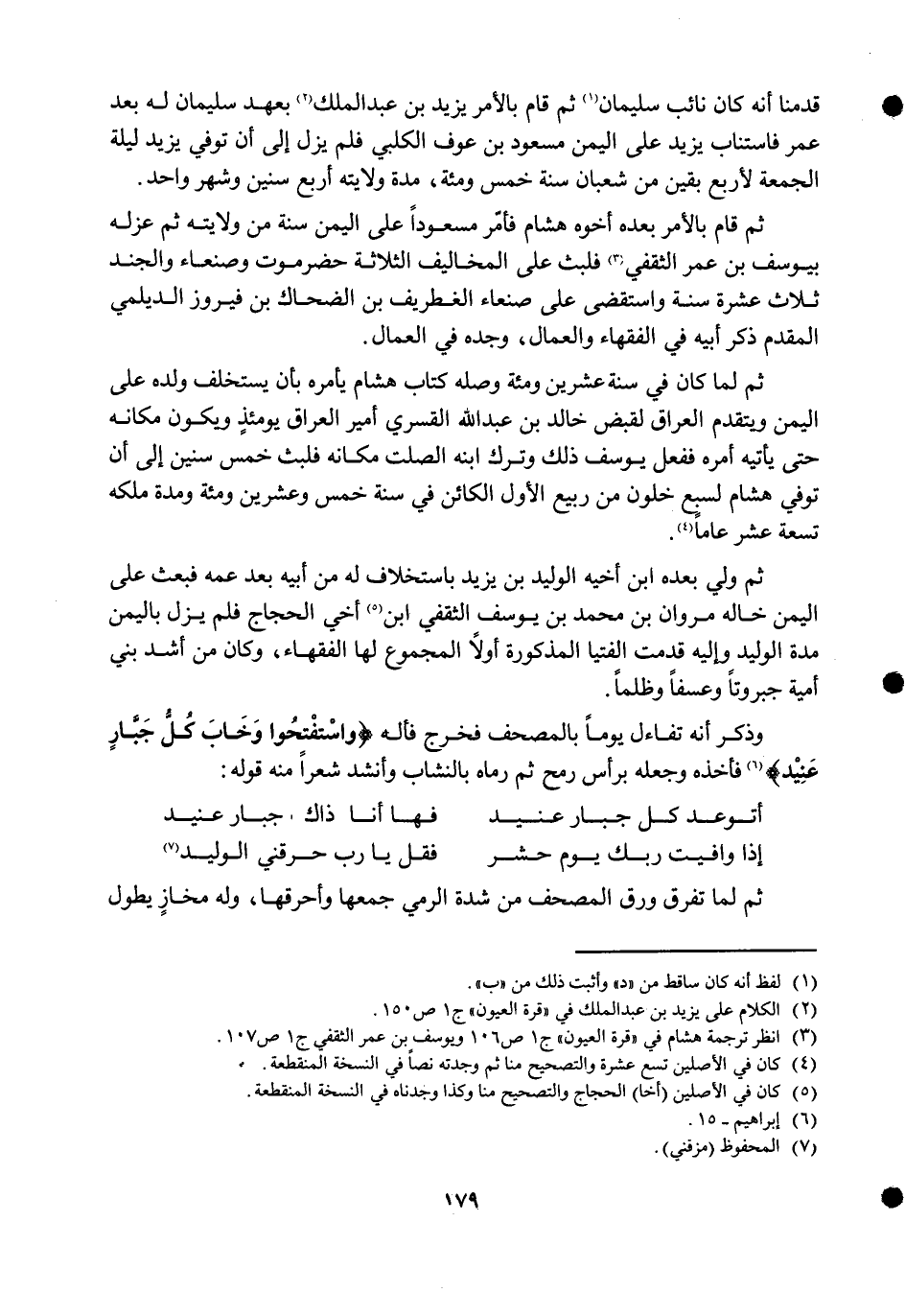ثمَّ ولي بعده ابْن أَخِيه الْوَلِيد بن يزِيد باستخلاف لَهُ من أَبِيه بعد عَمه فَبعث على الْيمن خَاله مَرْوَان بن مُحَمَّد بن يُوسُف الثَّقَفِيّ ابْن أخي الْحجَّاج فَلم يزل بِالْيمن مُدَّة الْوَلِيد وَإِلَيْهِ قدمت الْفتيا الْمَذْكُورَة أَولا الْمَجْمُوع لَهَا الْفُقَهَاء وَكَانَ من أَشد بني أُميَّة جبروتا وعسفا وظلما