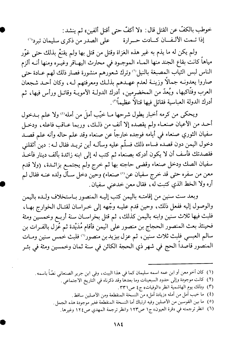 خُوطِبَ بالكف عَن الْقَتْل قَالَ لَا أكف حَتَّى أقتل أَلفَيْنِ ثمَّ ينشد ... إِذا تمت الألفان كَادَت حرارة ... على الصَّدْر من ذكرى سُلَيْمَان تبرد ... وَلم يكن لَهُ مَا يذم بِهِ غير هَذِه الْغُزَاة وَقتل من قتل بهَا وَلم يقنع بذلك حَتَّى غور مياها كَانَت بقاع الْجند مِنْهَا المَاء الْمَوْجُود فِي مَحَارِث اليهاقر وَغَيره وَمِنْهَا أَنه ألزم النَّاس لبس الثِّيَاب المصبغة بالنيل وَترك شُعُورهمْ منشورة فَصَارَ ذَلِك لَهُم عَادَة حَتَّى صَارُوا يعدونه جمالا وزينة لعدم عَهدهم بذلك ومعرفتهم لَهُ وَكَانَ أحد شجعان الْعَرَب وفتاكيها ويعد من المخضرمين أدْرك الدولة الأموية وَقَاتل وَرَأس فِيهَا ثمَّ أدْرك الدولة العباسية فقاتل فِيهَا قتالا عَظِيما