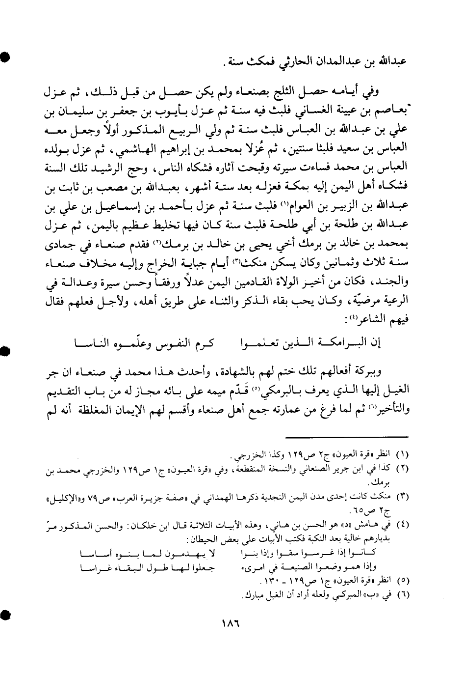 وَفِي أَيَّامه حصل الثَّلج بِصَنْعَاء وَلم يكن حصل من قبل ذَلِك ثمَّ عزل بعاصم بن عُيَيْنَة الغساني فَلبث فِيهِ سنة ثمَّ عزل بِأَيُّوب بن جَعْفَر بن سُلَيْمَان بن عَليّ بن عبد الله بن الْعَبَّاس فَلبث سنة ثمَّ ولي الرّبيع الْمَذْكُور أَولا وَجعل مَعَه الْعَبَّاس بن سعيد فلبثا سنتَيْن ثمَّ عزلا بِمُحَمد بن إِبْرَاهِيم الْهَاشِمِي ثمَّ عزل بولده الْعَبَّاس بن مُحَمَّد فَسَاءَتْ سيرته وقبحت آثاره فَشَكَاهُ النَّاس وَحج الرشيد تِلْكَ السّنة فَشَكَاهُ أهل الْيمن إِلَيْهِ بِمَكَّة فَعَزله بعد سِتَّة أشهر بِعَبْد الله بن مُصعب بن ثَابت بن عبد الله بن الزبير بن الْعَوام فَلبث سنة ثمَّ عزل بِأَحْمَد بن إِسْمَاعِيل بن عَليّ بن عبد الله بن طَلْحَة بن أبي طَلْحَة فَلبث سنة كَانَ فِيهَا تَخْلِيط عَظِيم بِالْيمن ثمَّ عزل بِمُحَمد بن خَالِد بن برمك أخي يحيى بن خَالِد بن برمك فَقدم صنعاء فِي جُمَادَى سنة ثَلَاث وَثَمَانِينَ وَكَانَ يسكن منكث أَيَّام جباية الْخراج وَإِلَيْهِ مخلاف صنعاء والجند فَكَانَ من أخير الْوُلَاة القادمين الْيمن عدلا ورفقا وَحسن سيرة وعدالة فِي الرّعية مرضية وَكَانَ يحب بَقَاء الذّكر وَالثنَاء على طَرِيق أَهله وَلأَجل فعلهم فَقَالَ فيهم الشَّاعِر ... إِن البرامكة الَّذين تعلمُوا ... كرم النُّفُوس وعلموه الناسا ... وببركة أفعالهم تِلْكَ ختم لَهُم بِالشَّهَادَةِ وأحدث هَذَا مُحَمَّد فِي صنعاء أَن جر الغيل إِلَيْهَا الَّذِي يعرف بالبرمكي قدم ميمه على بائه مجَاز لَهُ من بَاب التَّقْدِيم وَالتَّأْخِير ثمَّ لما فرغ من عِمَارَته جمع أهل صنعاء وَأقسم لَهُم الْإِيمَان الْمُغَلَّظَة أَنه لم